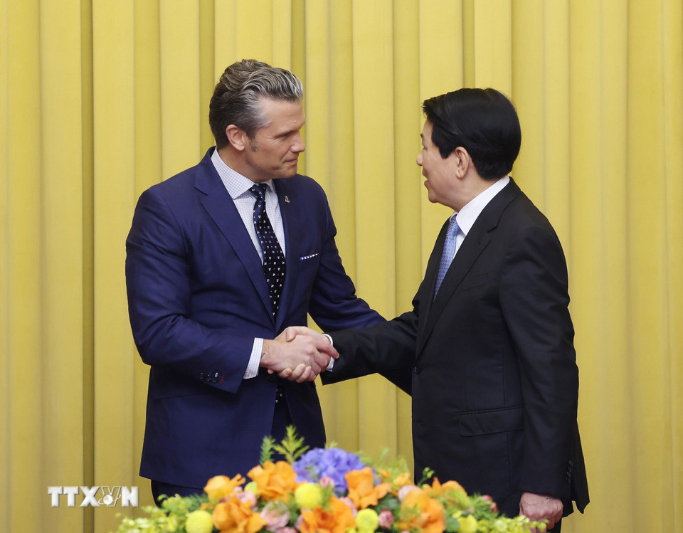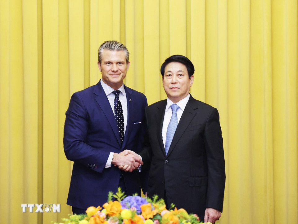 Chủ tịch nước Lương Cường tiếp Bộ trưởng Bộ Chiến tranh Hoa Kỳ Pete Hegseth. (Ảnh: Lâm Khánh/TTXVN)