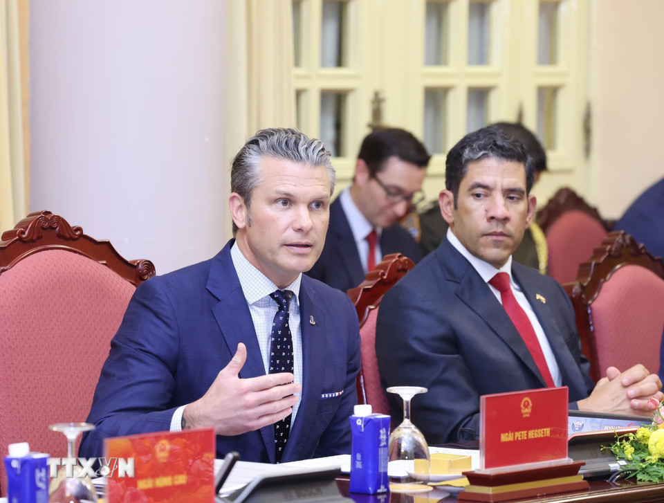 Chủ tịch nước Lương Cường với Bộ trưởng Bộ Chiến tranh Hoa Kỳ Pete Hegseth và các đại biểu. (Ảnh: Lâm Khánh/TTXVN)