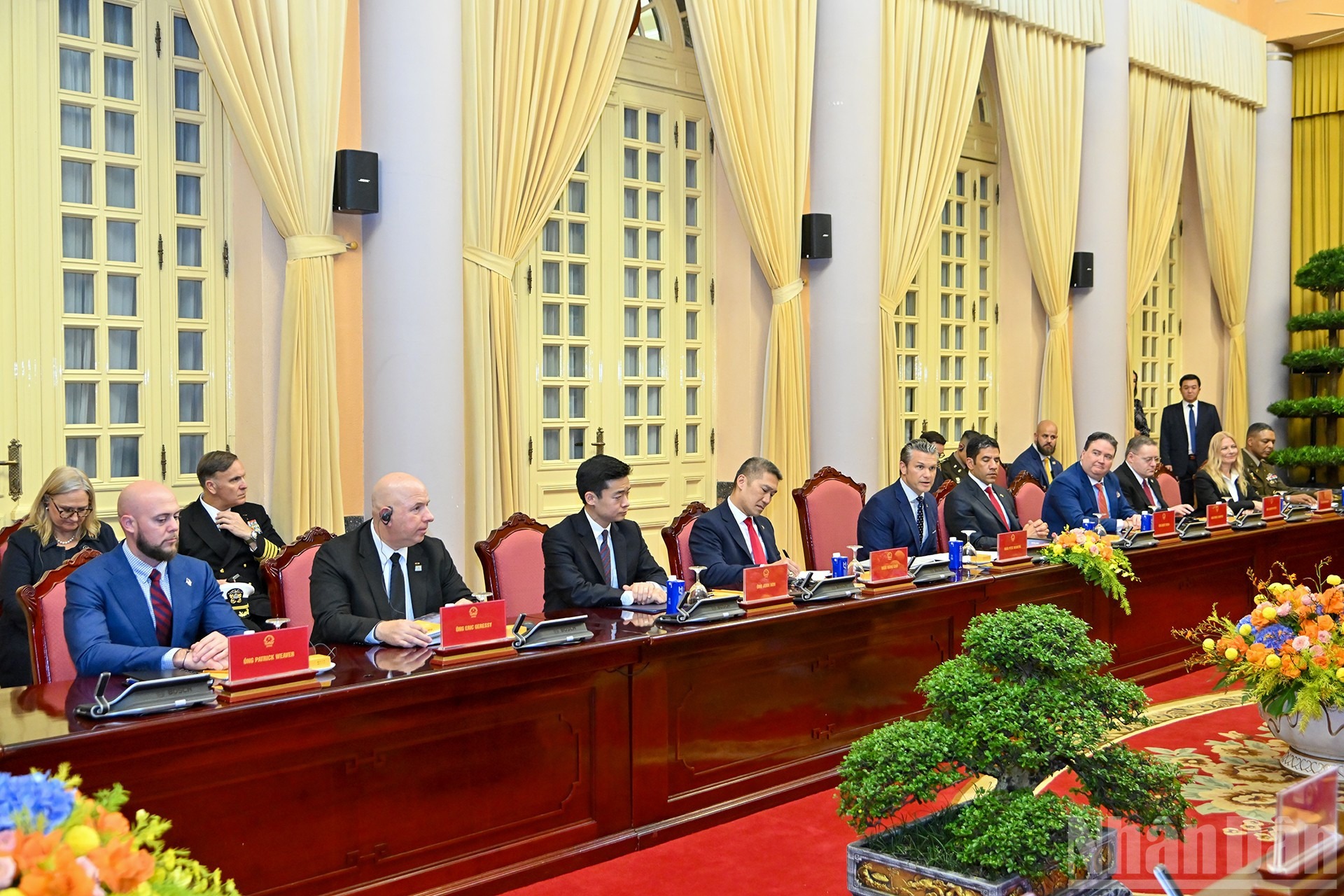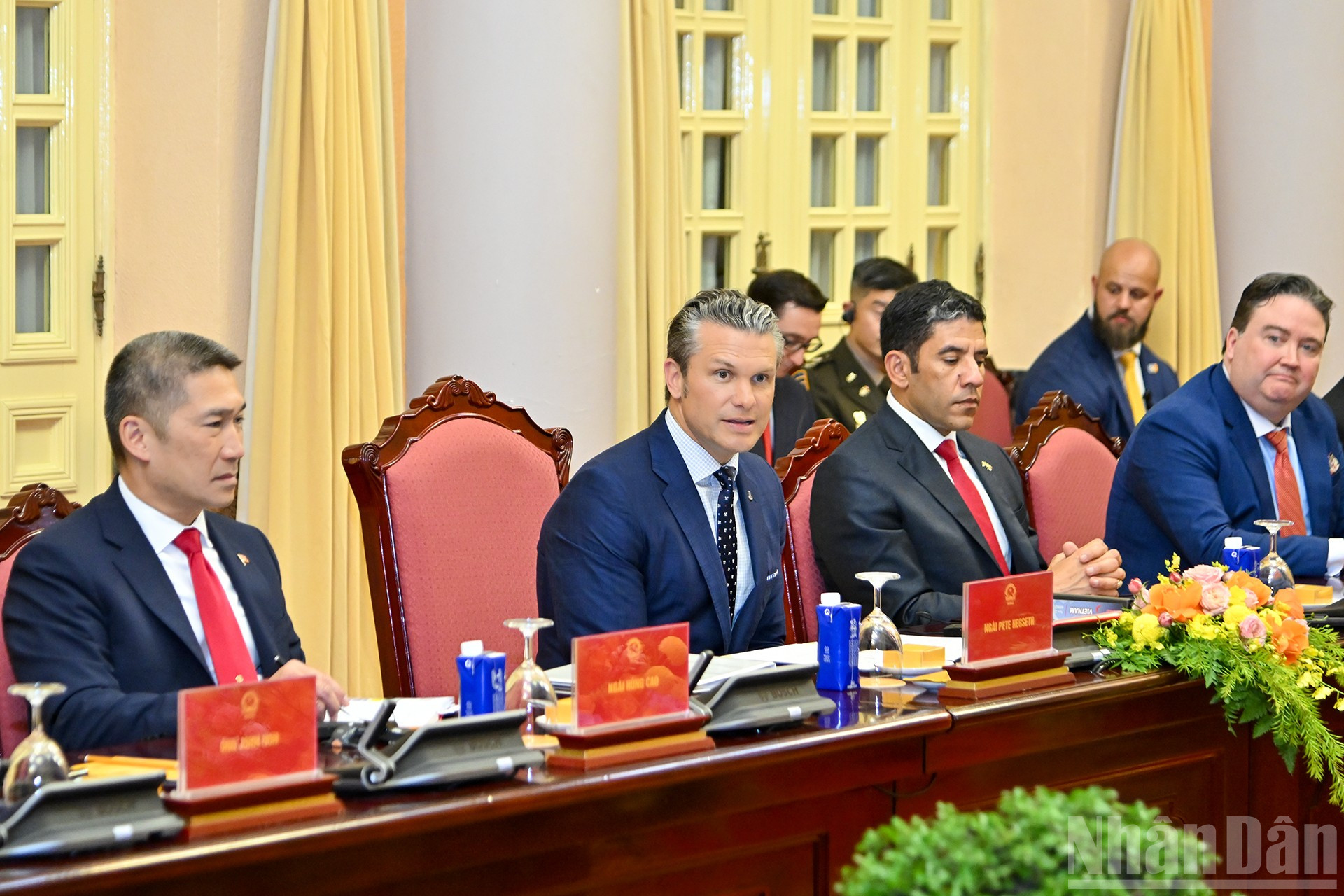 Bộ trưởng Chiến tranh Hoa Kỳ Pete Hegseth cùng các đại biểu tháp tùng tại buổi tiếp.