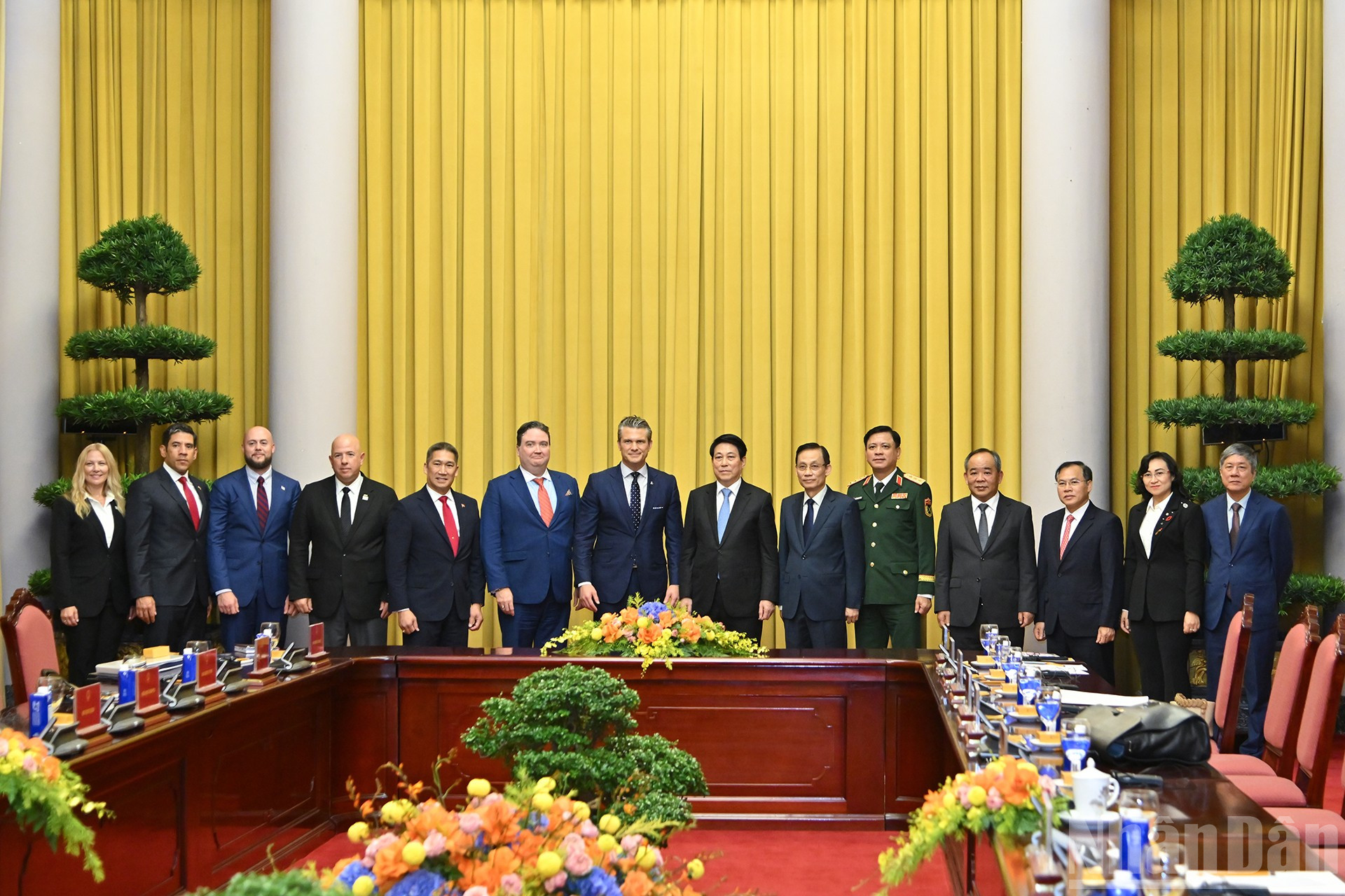 Chủ tịch nước Lương Cường và Bộ trưởng Chiến tranh Hoa Kỳ Pete Hegseth cùng các đại biểu tại buổi tiếp.