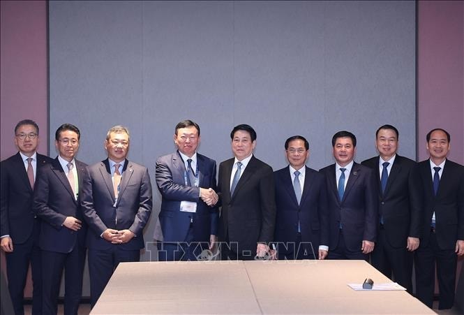 Chủ tịch nước Lương Cường với Chủ tịch Tập đoàn Lotte Shin Dong-bin và các đại biểu. Ảnh: Lâm Khánh/TTXVN