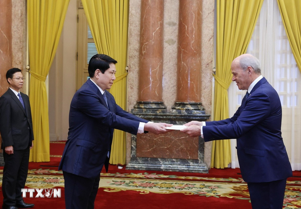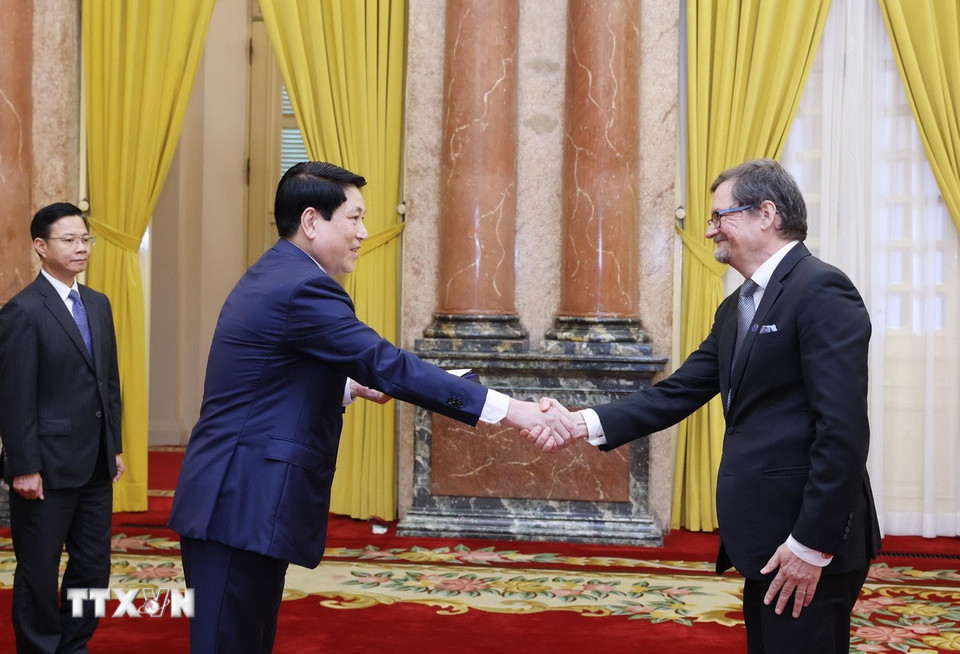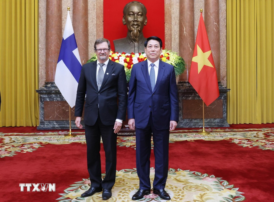 Chủ tịch nước Lương Cường tiếp nhận Quốc thư từ Đại sứ Cộng hòa Phần Lan tại Việt Nam Pekka Voutilainen. (Ảnh: Lâm Khánh/TTXVN)