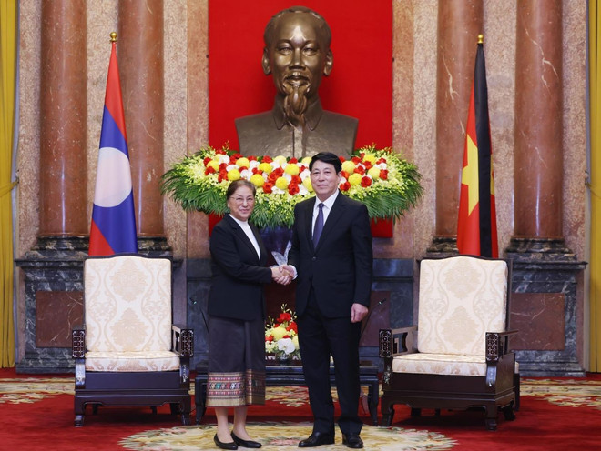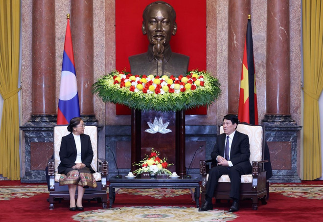 Chủ tịch nước Lương Cường tiếp Phó Chủ tịch nước Lào Pany Yathotou. (Ảnh: Lâm Khánh/TTXVN)
