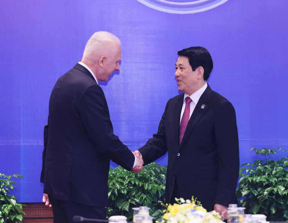 Chủ tịch nước Lương Cường tiếp Tổng Công tố Nga Alexander Vladimirovich Gutsan. (Ảnh: Lâm Khánh/TTXVN)
