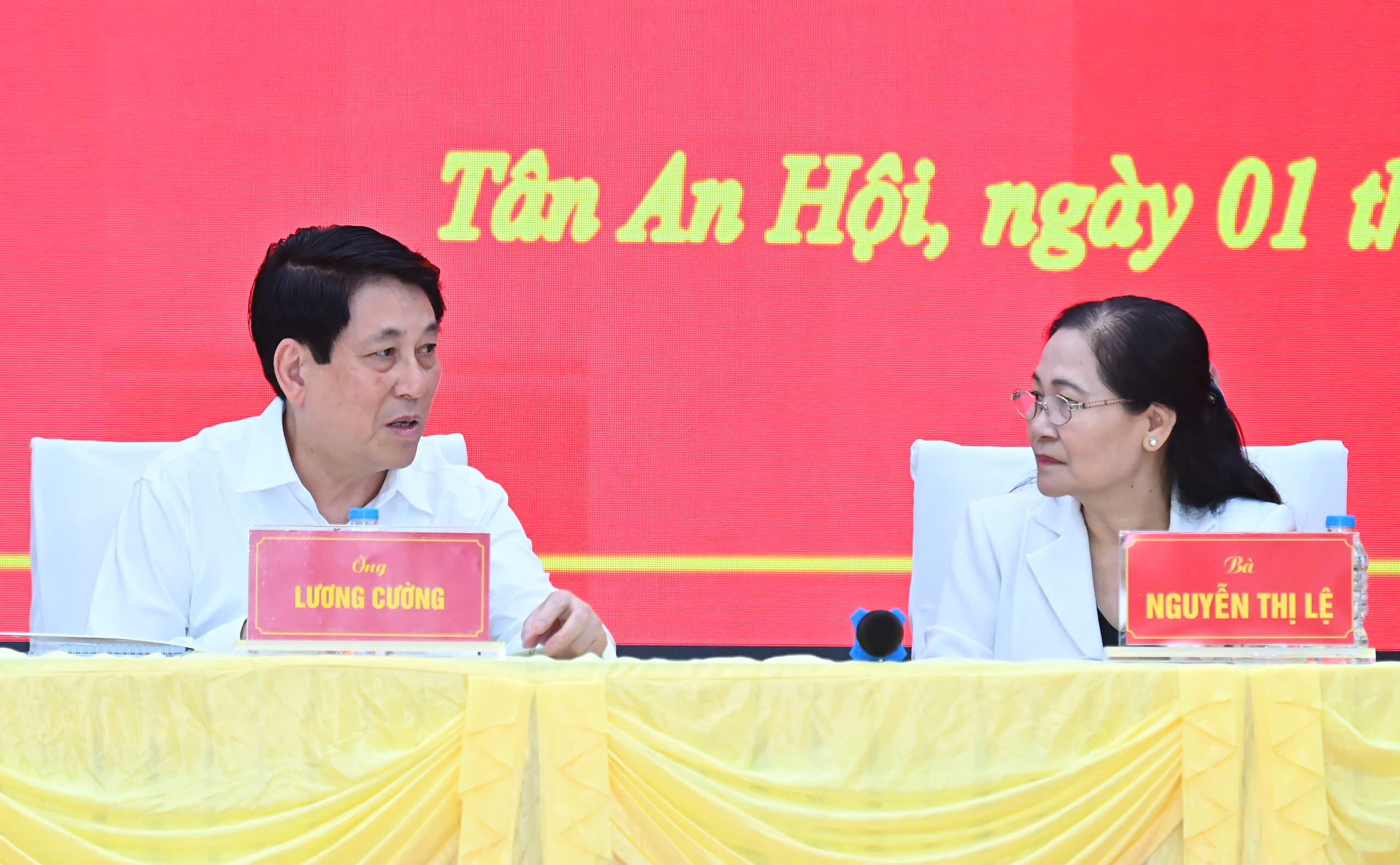 Chủ tịch nước Lương Cường và đồng chí Nguyễn Thị Lệ, nguyên Phó Bí thư Thành ủy, nguyên Chủ tịch HĐND TPHCM, tại buổi tiếp xúc cử tri. Ảnh: VIỆT DŨNG