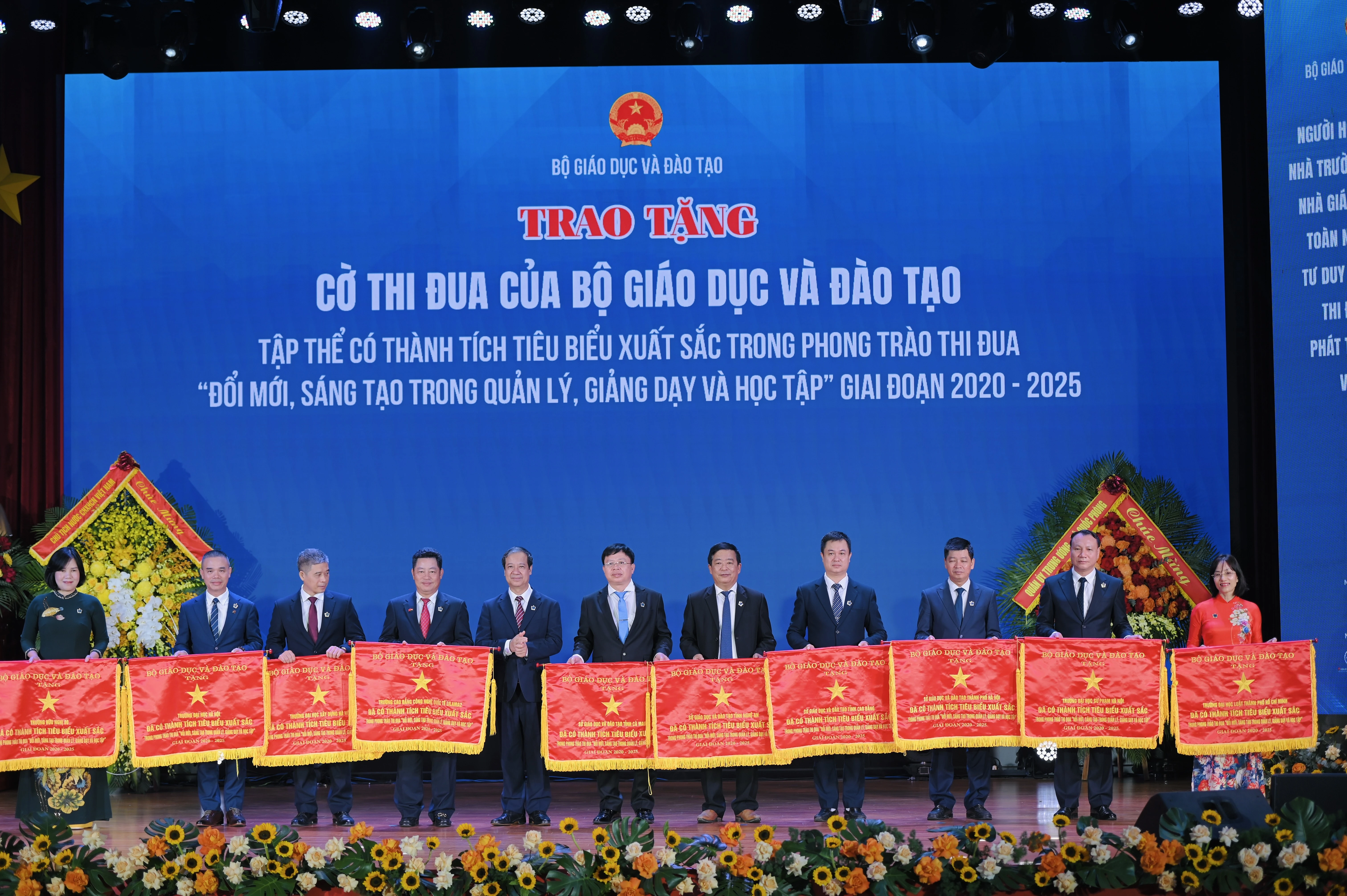 Bộ trưởng GD&ĐT Nguyễn Kim Sơn trao tặng cờ thi đua cho các tập thể có thành tích tiêu biểu xuất sắc. Ảnh: Bộ GD&ĐT.