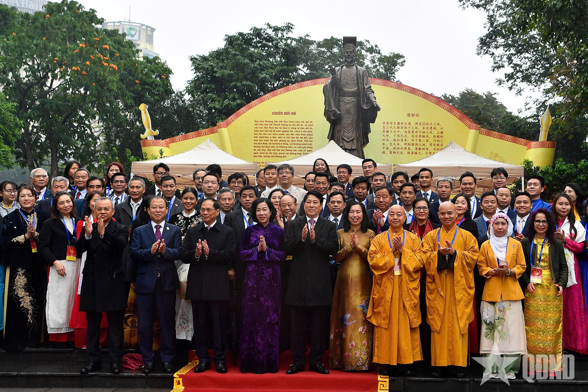 Chủ tịch nước Lương Cường cùng Phu nhân và các đại biểu chụp ảnh lưu niệm trước tượng đài Lý Thái Tổ (Hà Nội). Ảnh: TRỌNG HẢI
