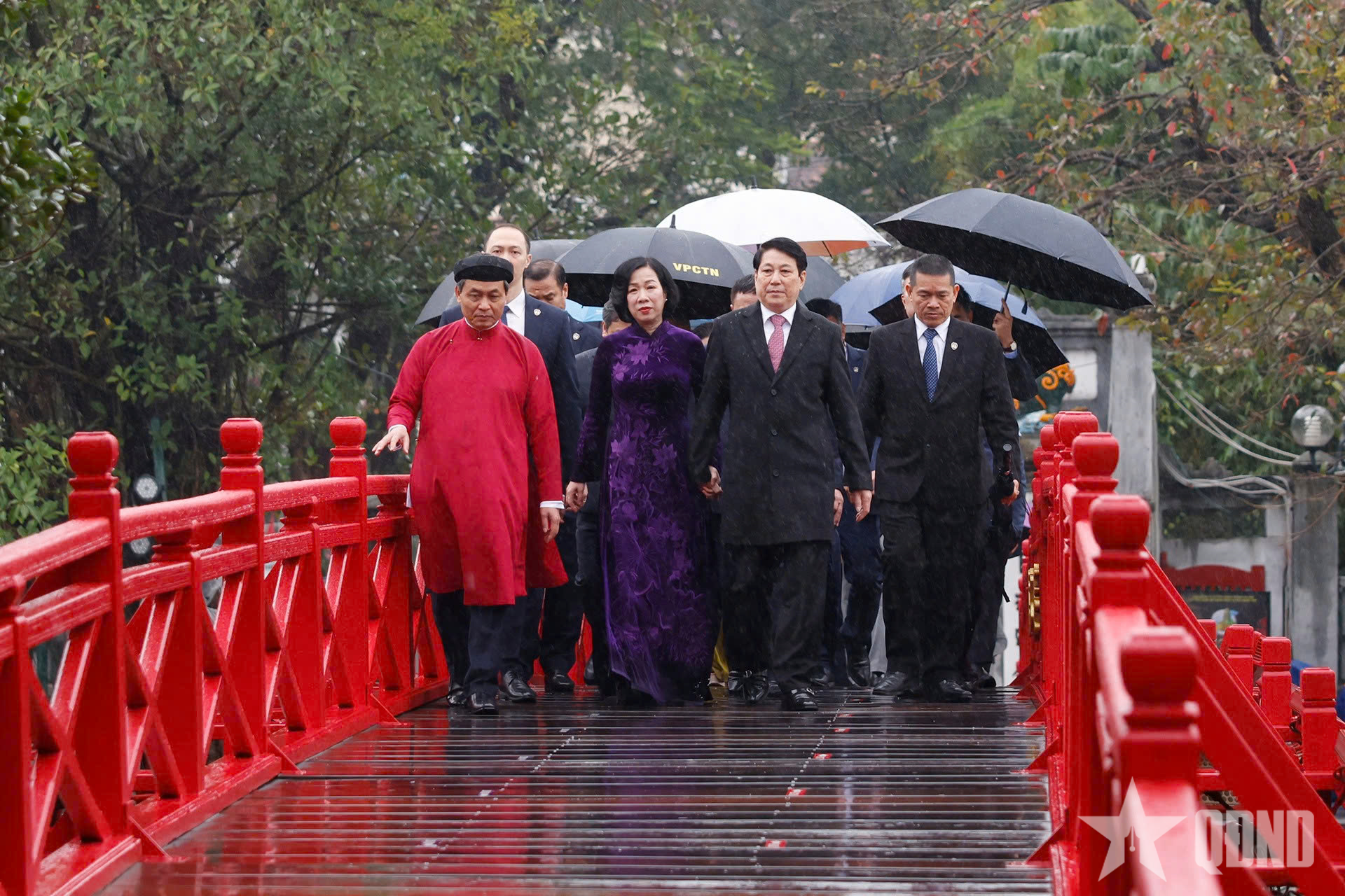 Chủ tịch nước Lương Cường và Phu nhân cùng đoàn kiều bào tiêu biểu tại Đền Ngọc Sơn. Ảnh: TRỌNG HẢI