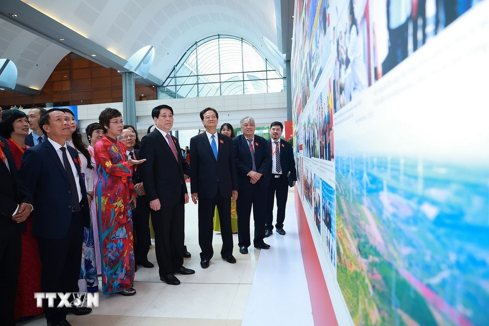 Chủ tịch nước Lương Cường, nguyên Thủ tướng Nguyễn Tấn Dũng tham quan triển lãm ảnh về Đại hội. (Ảnh: TTXVN)