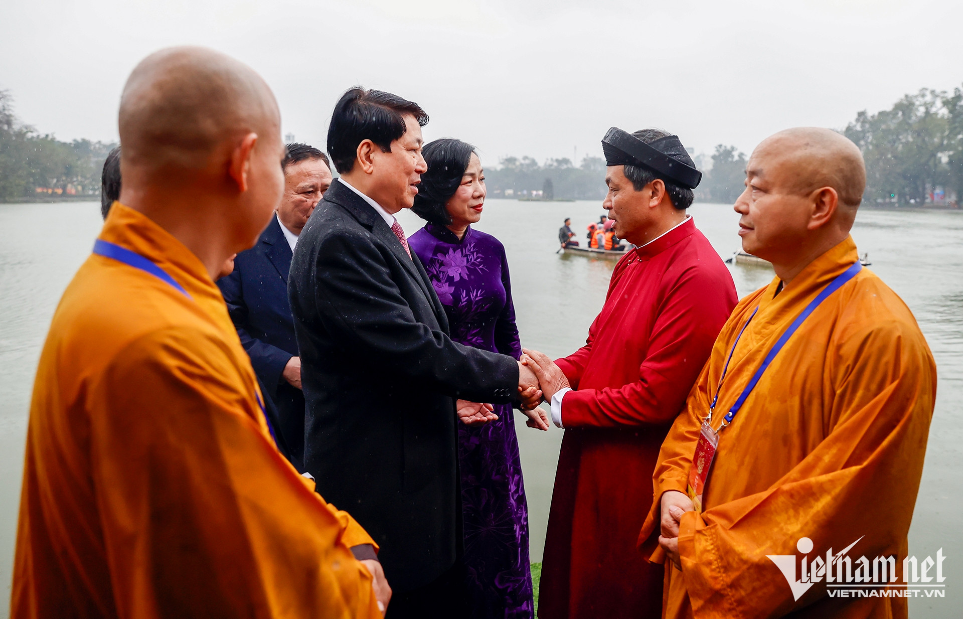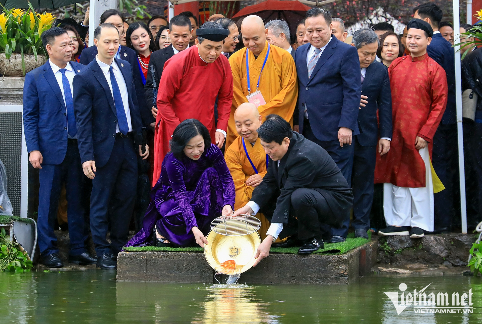 Chủ tịch nước và phu nhân cùng các đại biểu kiều bào đã tham gia hoạt động thả cá chép tại hồ Hoàn Kiếm