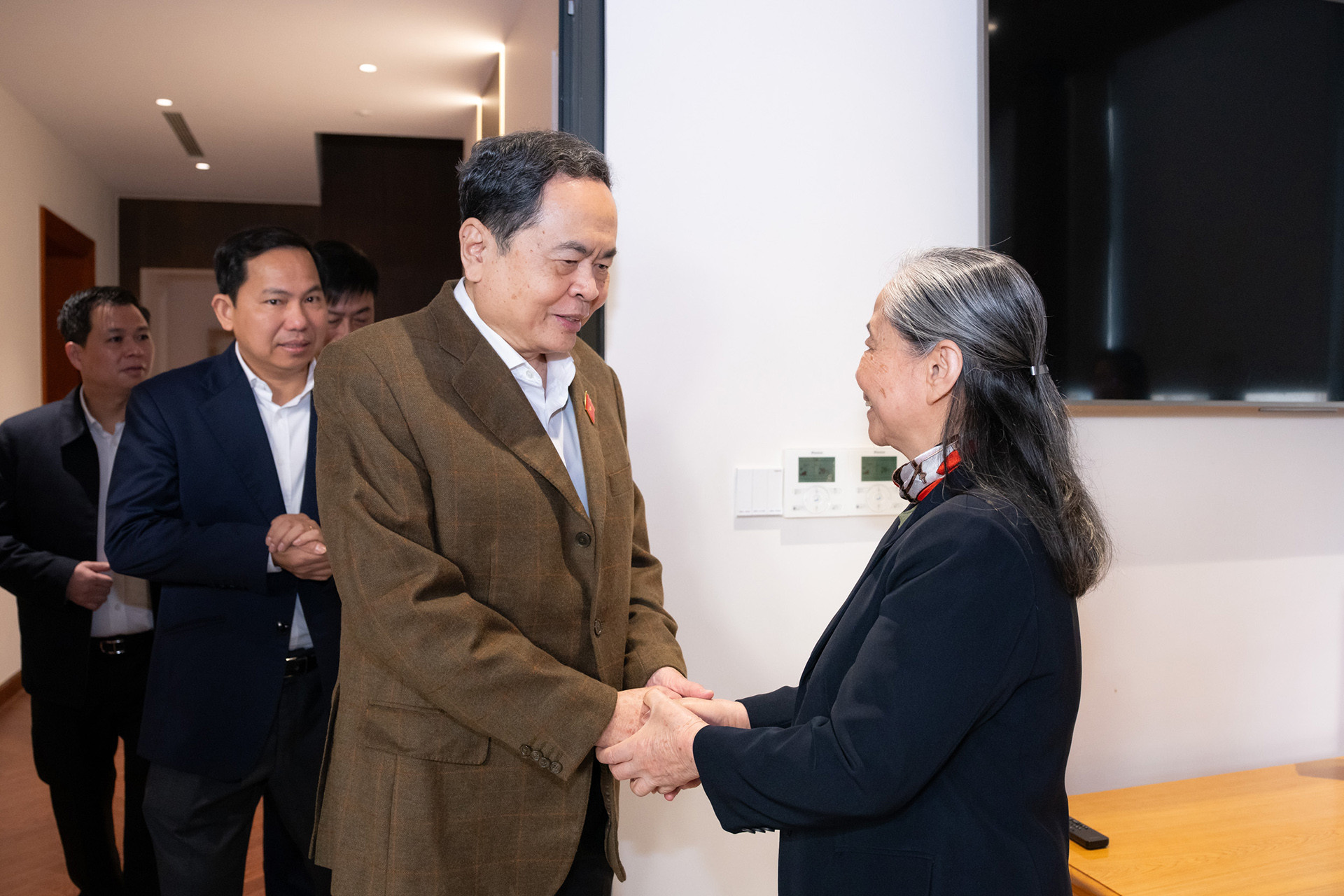 Chủ tịch Quốc hội Trần Thanh Mẫn thăm hỏi phu nhân Ngô Thị Mận. Ảnh: Quốc hội