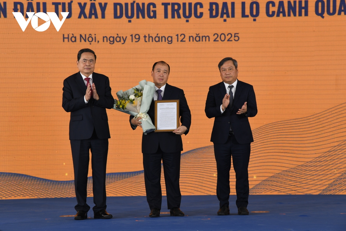 Chủ tịch Quốc hội Trần Thanh Mẫn và Chủ tịch UBND TP Hà Nội Vũ Đại Thắng trao quyết định cho đại diện liên danh các nhà đầu tư