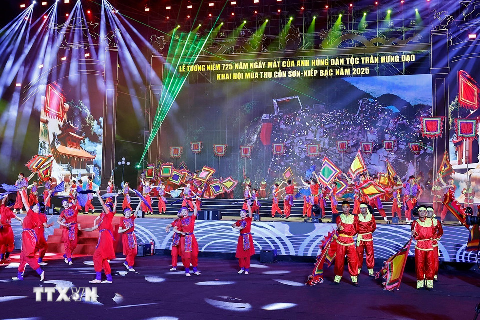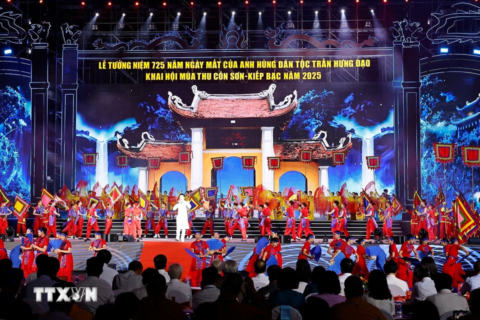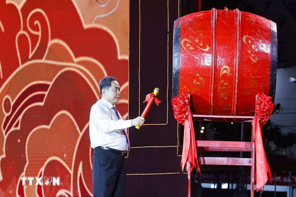 Chủ tịch Quốc hội Trần Thanh Mẫn đánh trống khai hội Lễ hội mùa Thu Côn Sơn-Kiếp Bạc năm 2025. (Ảnh: Doãn Tấn/TTXVN)