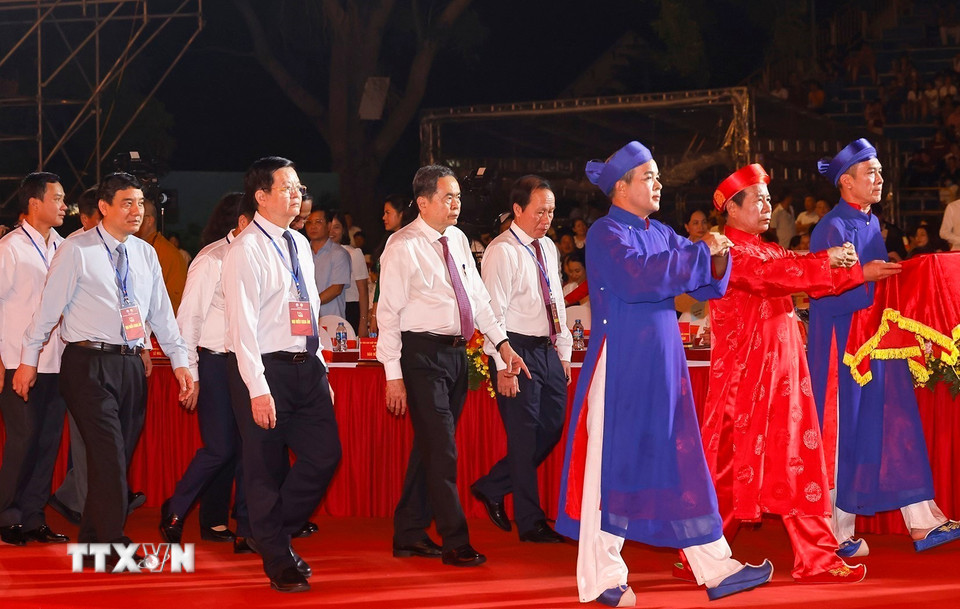 Chủ tịch Quốc hội Trần Thanh Mẫn và đoàn đại biểu rước Văn tế vào Đền Kiếp Bạc. (Ảnh: Doãn Tấn/TTXVN)
