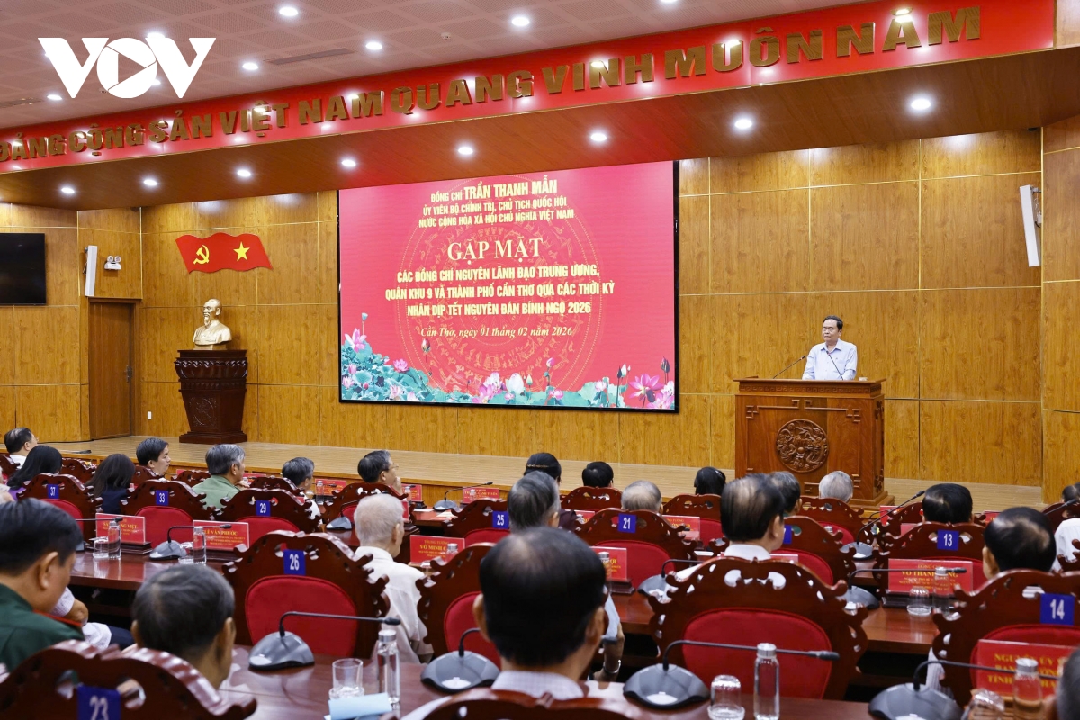 Chủ tịch Quốc hội trân trọng chuyển lời thăm hỏi ân cần và lời chúc mừng năm mới tốt đẹp nhất của Tổng Bí thư Tô Lâm và Thủ tướng Chính phủ Phạm Minh Chính tới các lãnh đạo, nguyên lãnh đạo TP Cần Thơ cùng toàn thể Nhân dân TP Cần Thơ.