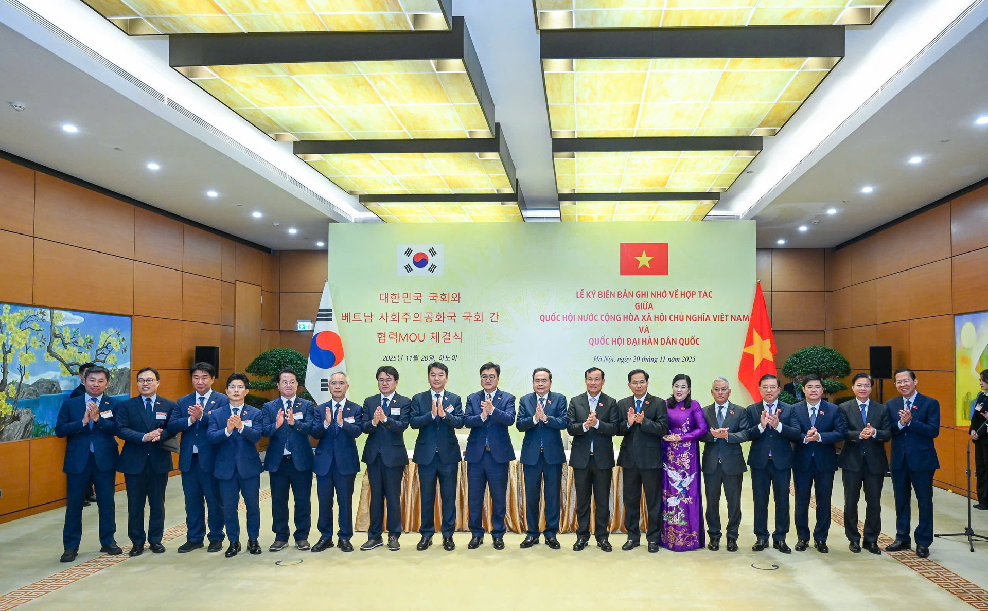 Chủ tịch Quốc hội Trần Thanh Mẫn và Chủ tịch Quốc hội Hàn Quốc Woo Won Shik ký biên bản ghi nhớ về hợp tác. Ảnh: Phạm Hải
