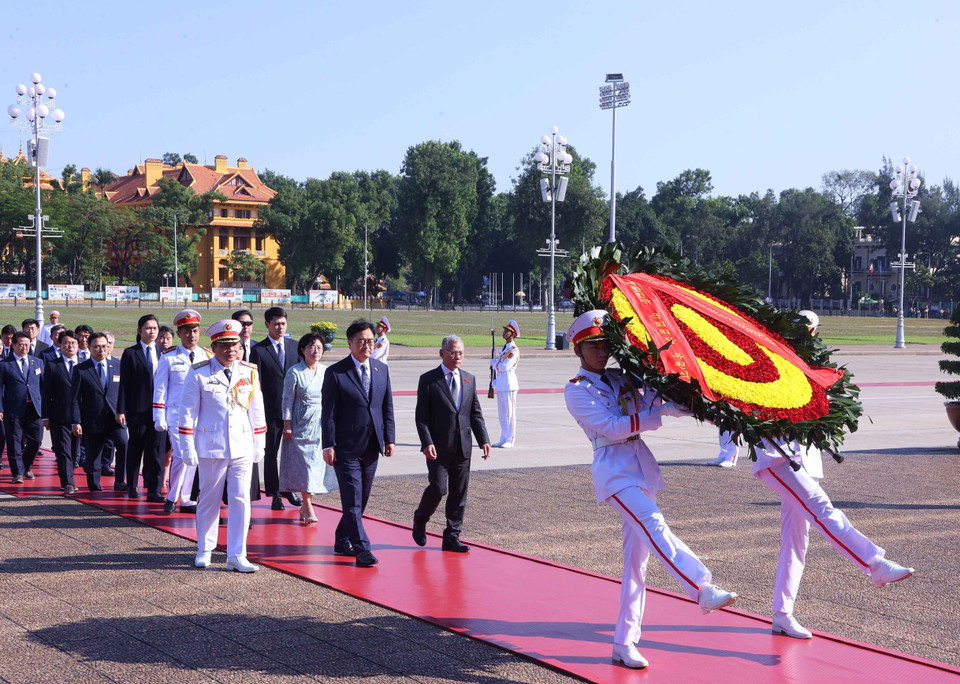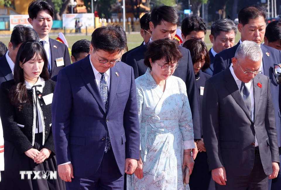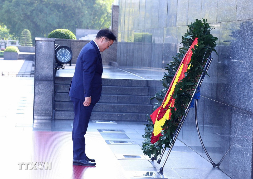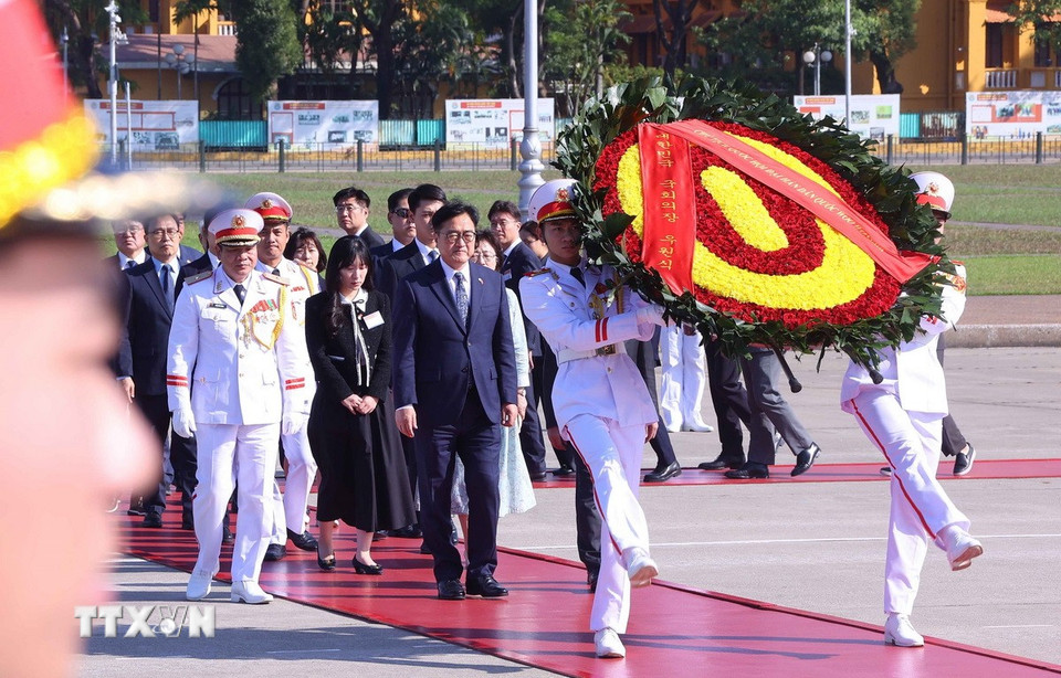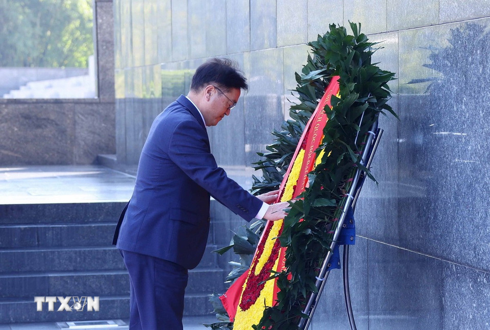 Chủ tịch Quốc hội Đại Hàn Dân Quốc Woo Won Shik đặt vòng hoa và vào Lăng viếng Chủ tịch Hồ Chí Minh. (Ảnh: Văn Điệp/TTXVN)
