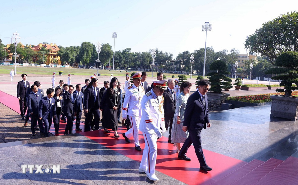 Chủ tịch Quốc hội Đại Hàn Dân Quốc Woo Won Shik và Phu nhân tưởng niệm Chủ tịch Hồ Chí Minh. (Ảnh: Văn Điệp /TTXVN)