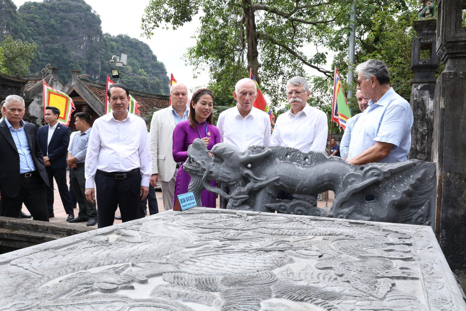 Chủ tịch Quốc hội Hungary Kover Laszlo cùng đoàn công tác nghe giới thiệu về Long sàng, bảo vật quốc gia tại Đền thờ Vua Đinh Tiên Hoàng thuộc Khu di tích quốc gia đặc biệt Cố đô Hoa Lư. (Ảnh: Đức Phương/TTXVN)