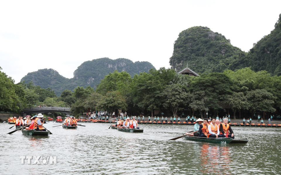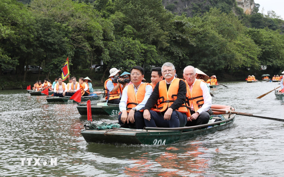 Đoàn Công tác Quốc hội Hungary tham quan Khu du lịch sinh thái Tràng An thuộc Di sản văn hóa và thiên nhiên thế giới Quần thể danh thắng Tràng An. (Ảnh: Đức Phương/TTXVN)