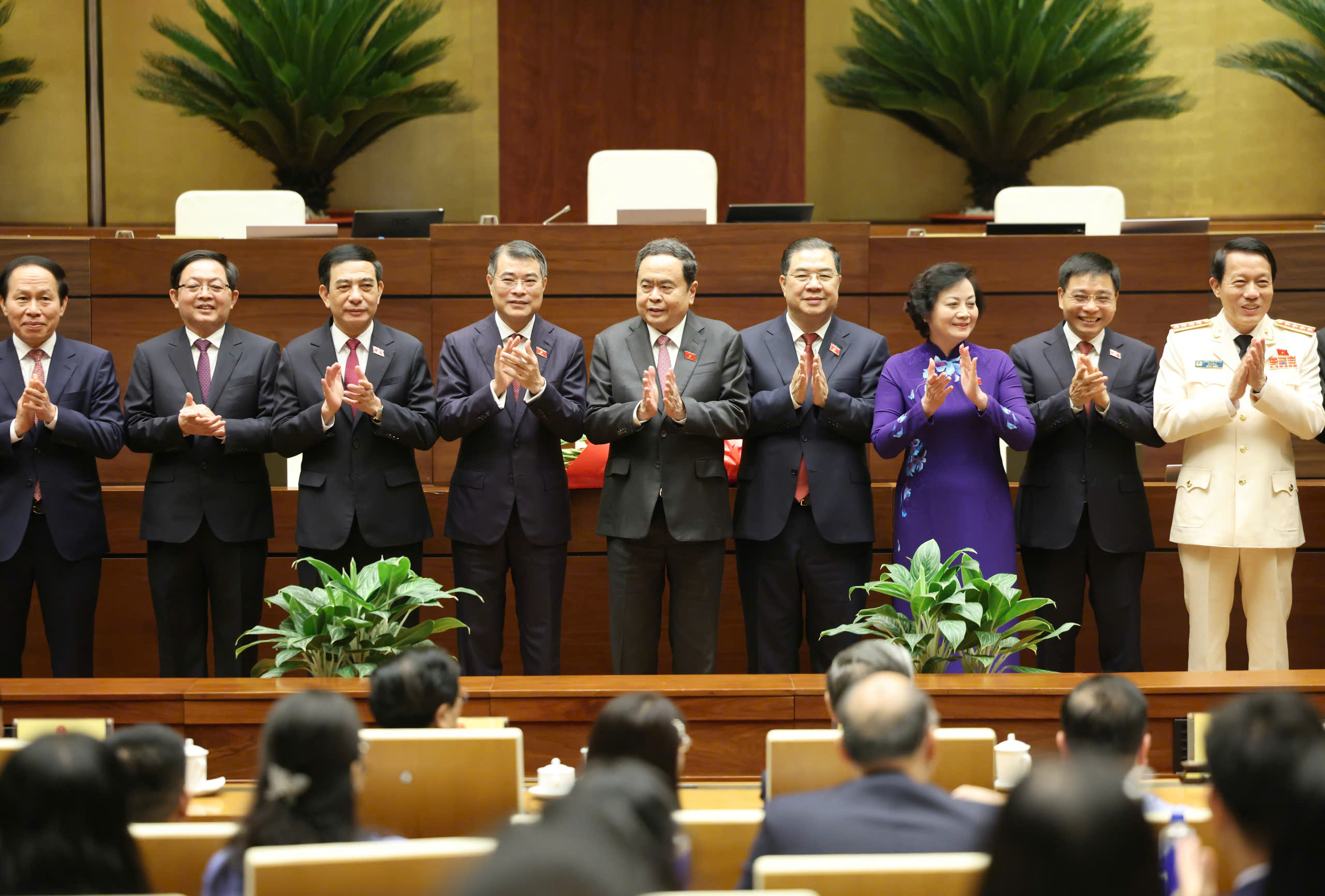 Sáng 8-4, ngay sau khi kết quả biểu quyết được công bố, Chủ tịch Quốc hội Trần Thanh Mẫn đã tặng hoa chúc mừng Thủ tướng Chính phủ, các Phó Thủ tướng, Bộ trưởng và các thành viên khác của Chính phủ vừa được Quốc hội phê chuẩn bổ nhiệm.