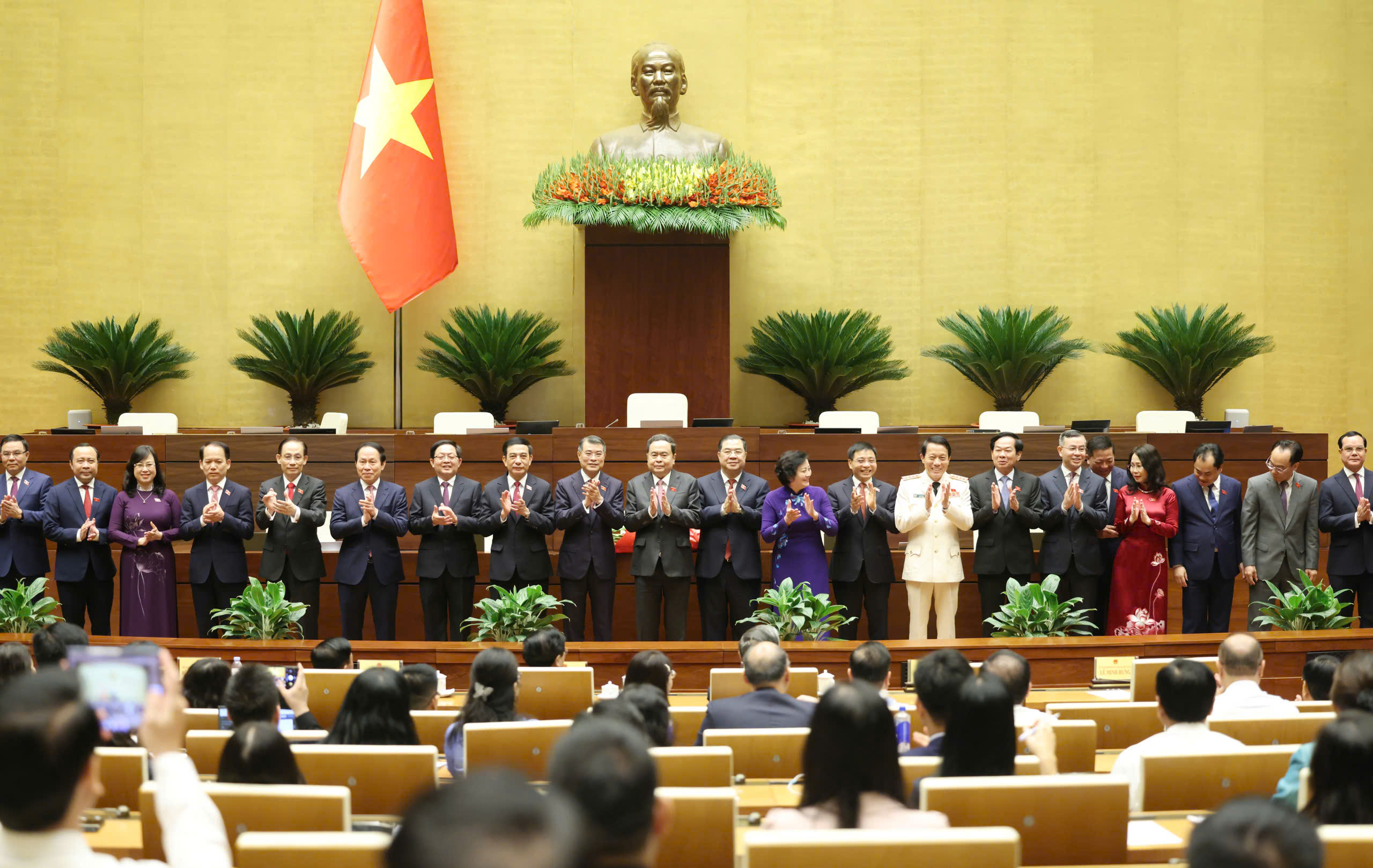 Chủ tịch Quốc hội Trần Thanh Mẫn tặng hoa chúc mừng Thủ tướng, Phó Thủ tướng Chính phủ, Bộ trưởng và thành viên khác của Chính phủ nhiệm kỳ 2026-2031. Ảnh: TTXVN
