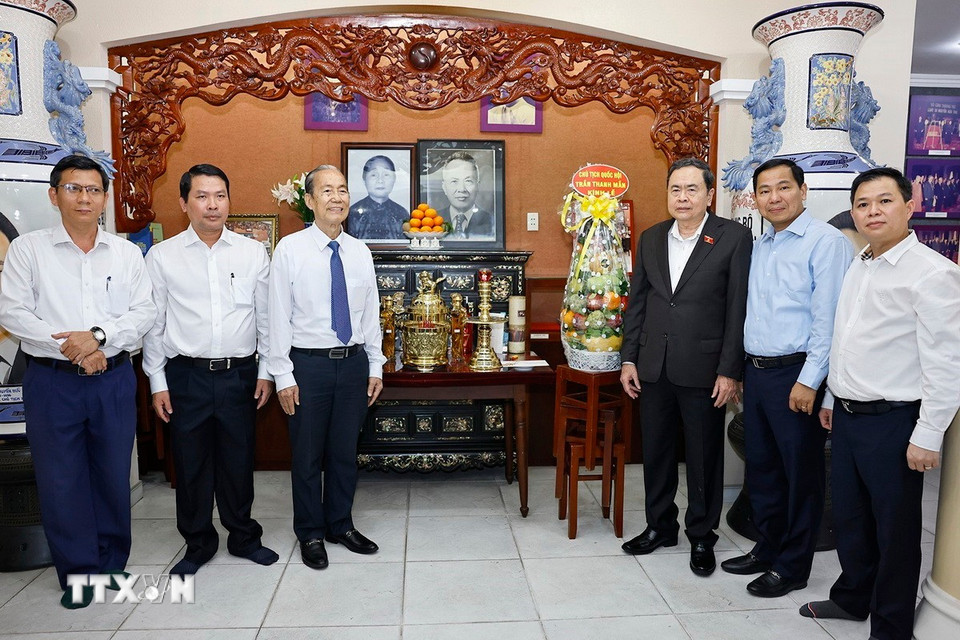 Chủ tịch Quốc hội Trần Thanh Mẫn đến thăm gia đình, thắp hương tưởng nhớ, tri ân và tặng quà, chúc Tết gia đình cố Chủ tịch Quốc hội Nguyễn Hữu Thọ. (Ảnh: Doãn Tấn/TTXVN)