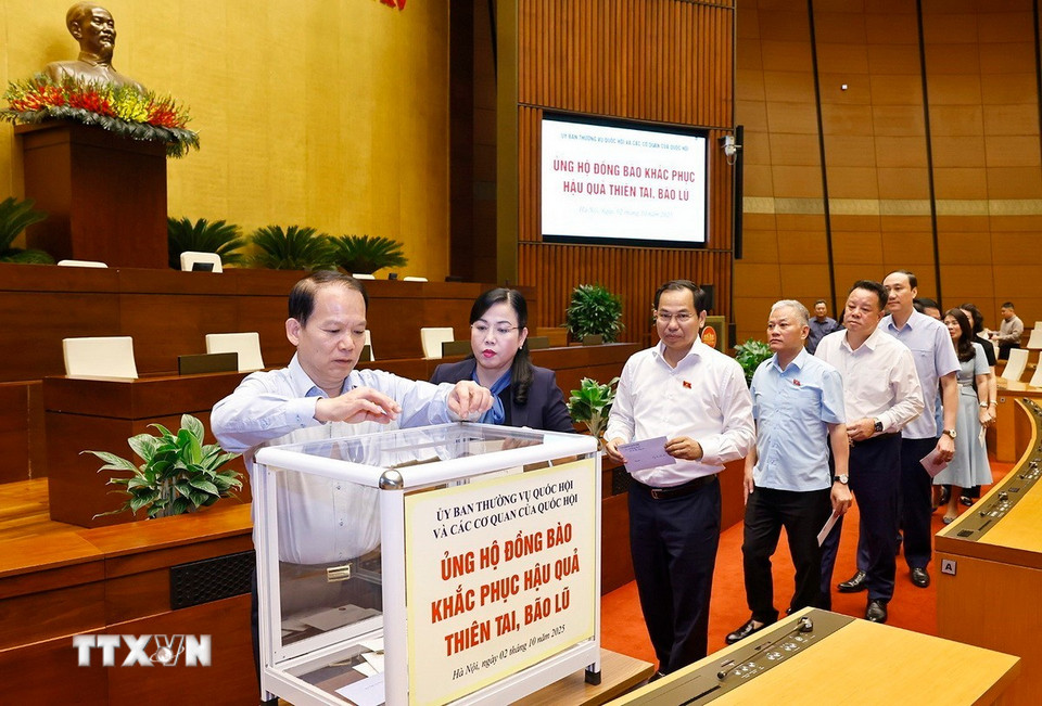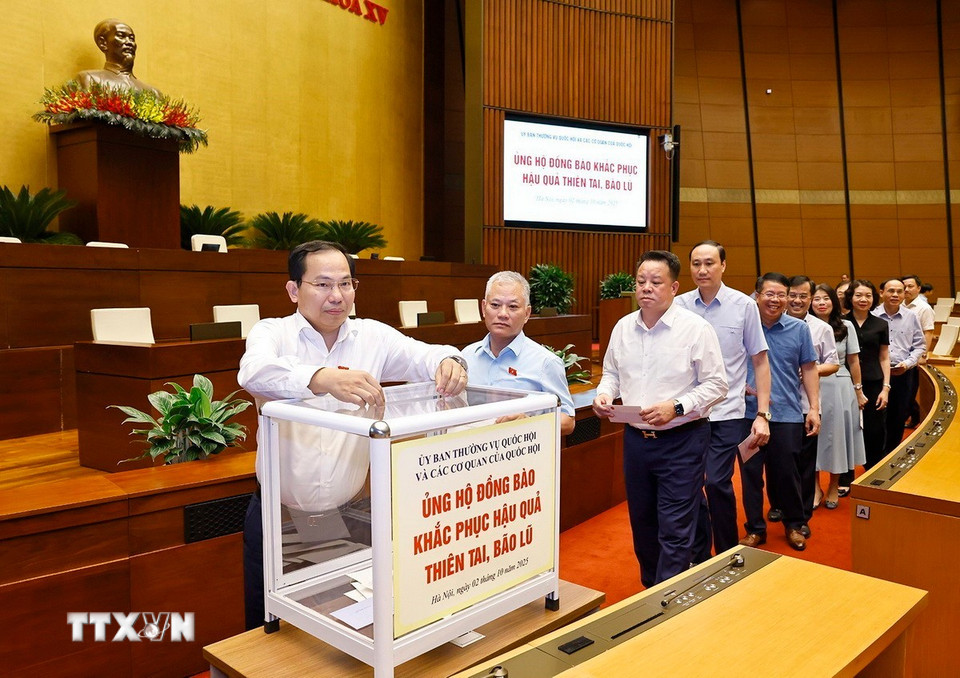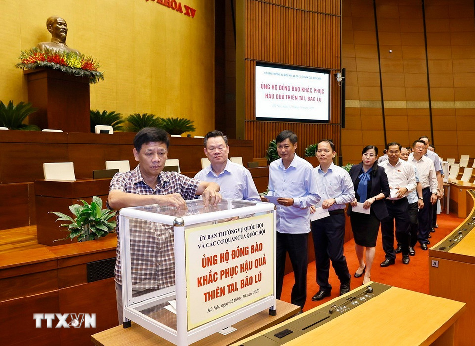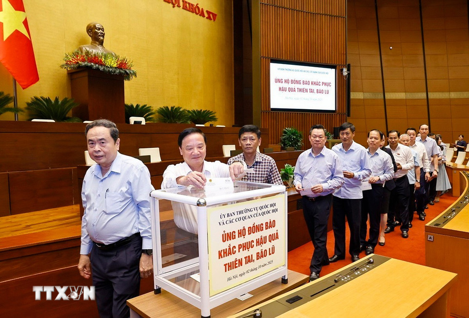 Chủ tịch Quốc hội Trần Thanh Mẫn cùng lãnh đạo Quốc hội, cán bộ, nhân viên các cơ quan của Quốc hội tham gia Lễ ủng hộ đồng bào khắc phục hậu quả thiên tai, bão lũ. (Ảnh: Doãn Tấn/TTXVN)