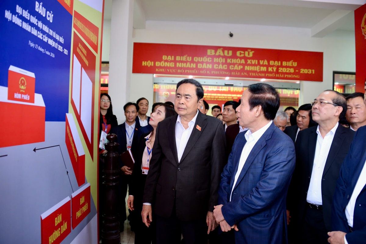 Tại điểm bỏ phiếu của phường Hải An, TP Hải Phòng, Chủ tịch Quốc hội Trần Thanh Mẫn, Chủ tịch Hội đồng bầu cử quốc gia đã thực địa, khảo sát cơ sở vật chất, điều kiện làm việc của tổ bầu cử, cũng như công tác tập huấn cho các thành viên của tổ bầu cử, đặc biệt là những thành viên mới tham gia lần đầu.