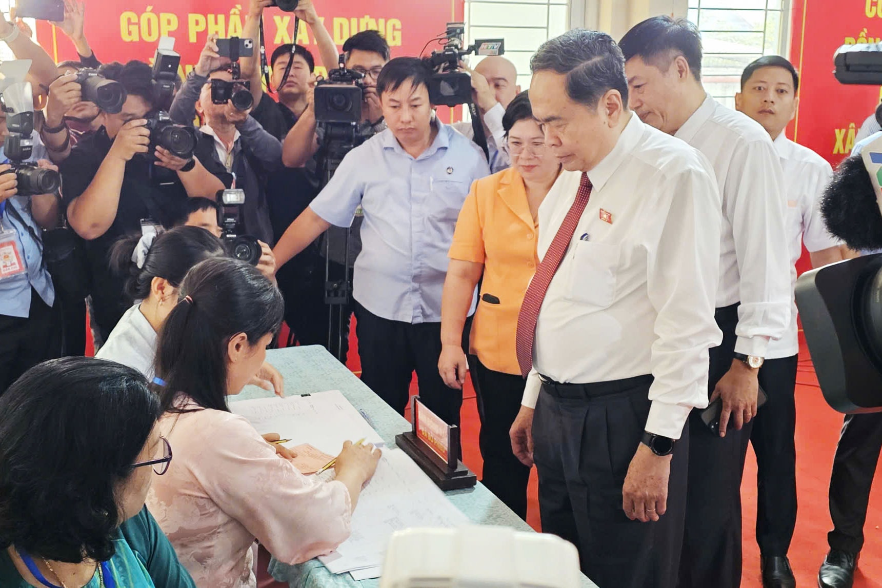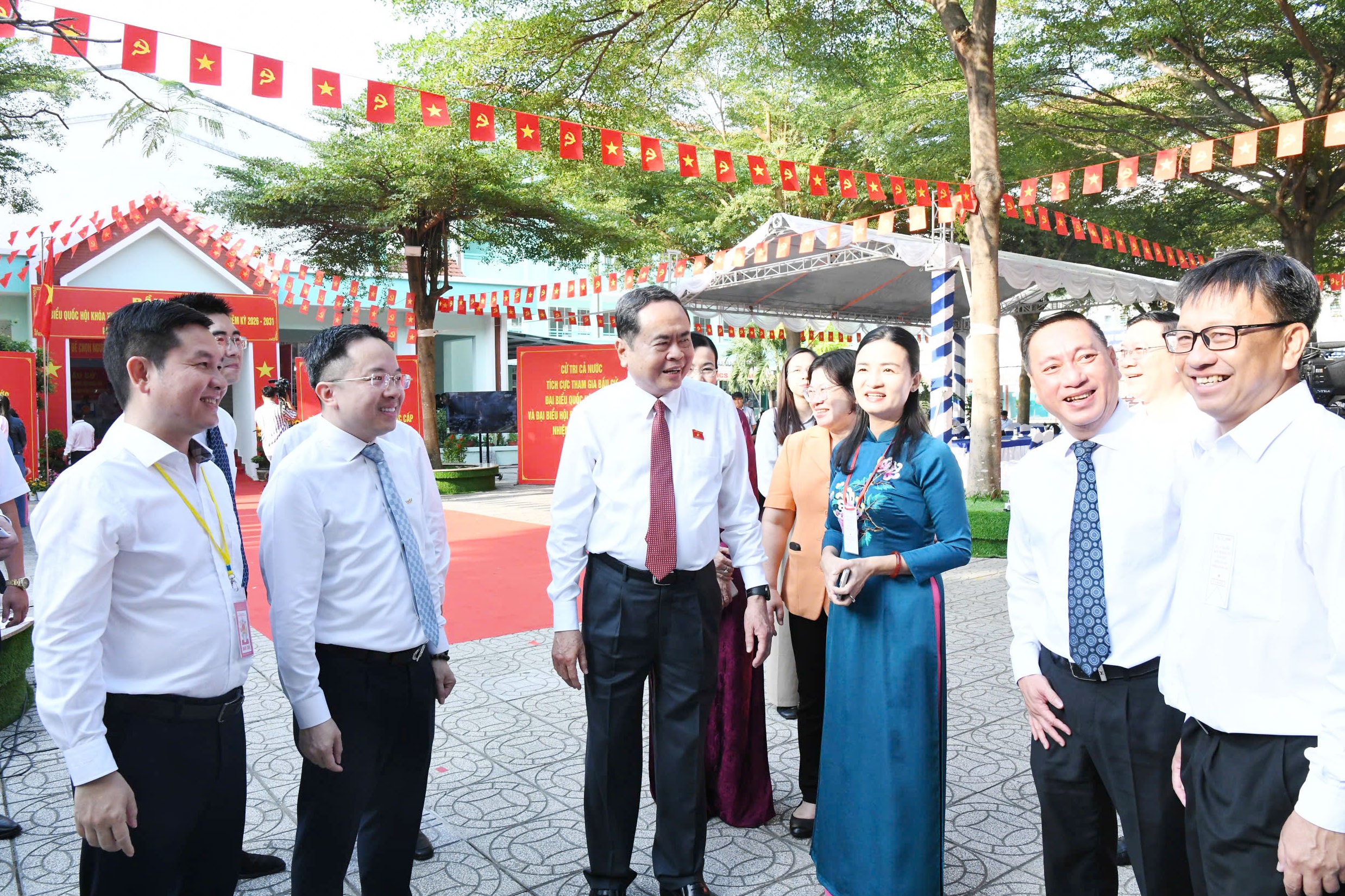 Chủ tịch Quốc hội, Chủ tịch Hội đồng Bầu cử quốc gia Trần Thanh Mẫn thực hiện quyền bầu cử và kiểm tra công tác tổ chức bầu cử tại Khu vực bỏ phiếu số 14, Trường THCS Đỗ Văn Dậy, xã Hóc Môn, TP. Hồ Chí Minh