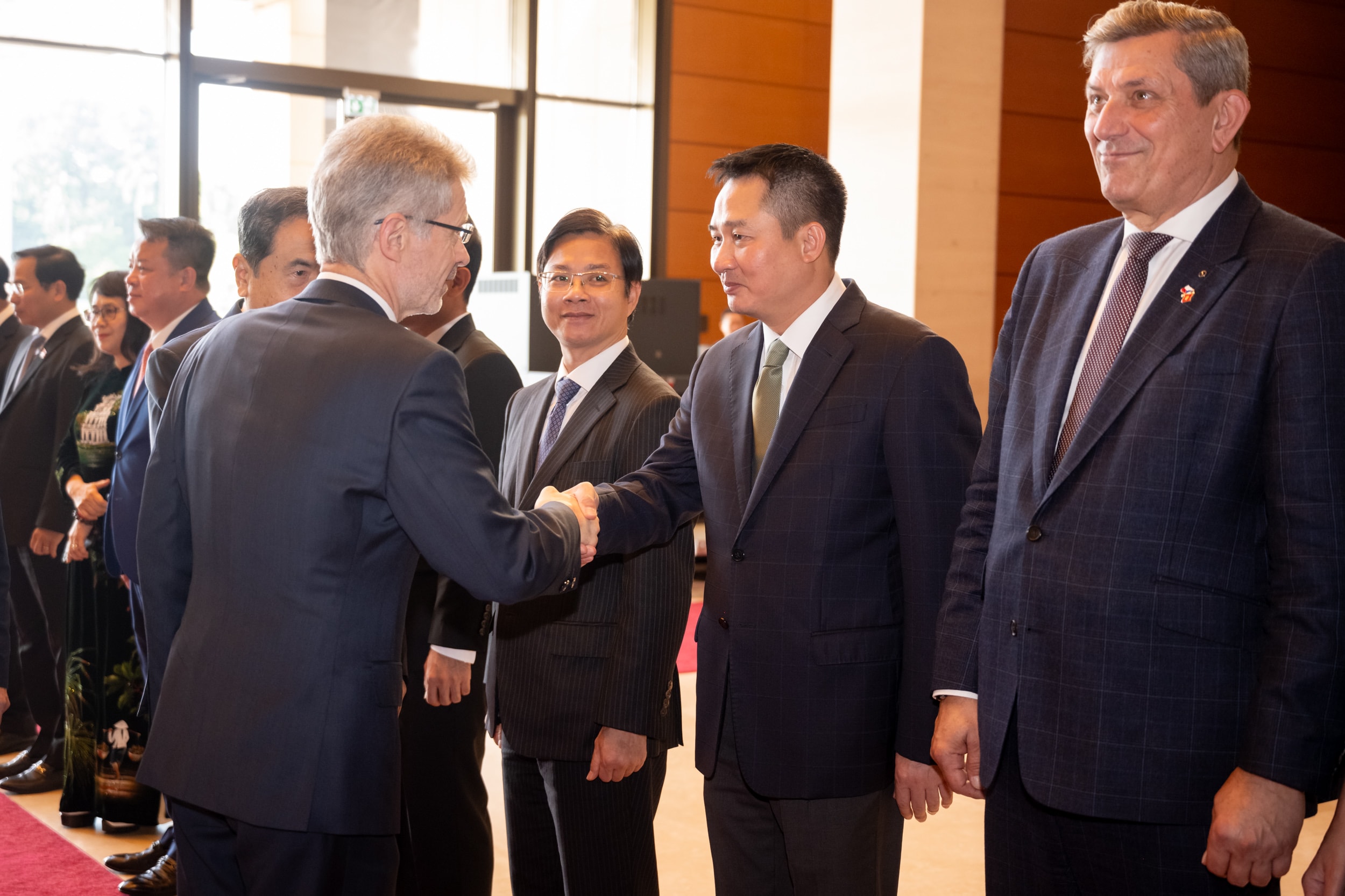 Chủ tịch Quốc hội Trần Thanh Mẫn giới thiệu với Chủ tịch Thượng viện Quốc hội Cộng hòa Czech Milos Vystrcil các thành viên Đoàn đại biểu cấp cao Quốc hội Việt Nam