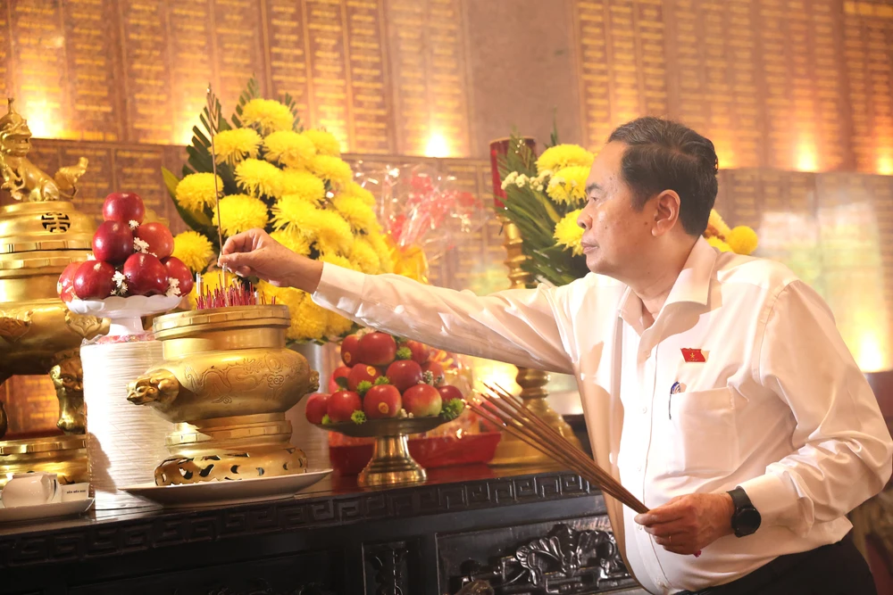 Ủy viên Bộ Chính trị, Chủ tịch Quốc hội Trần Thanh Mẫn dâng hương, dâng hoa tại đền Bến Dược, xã Củ Chi trước buổi tiếp xúc cử tri. Ảnh: LÊ THOA