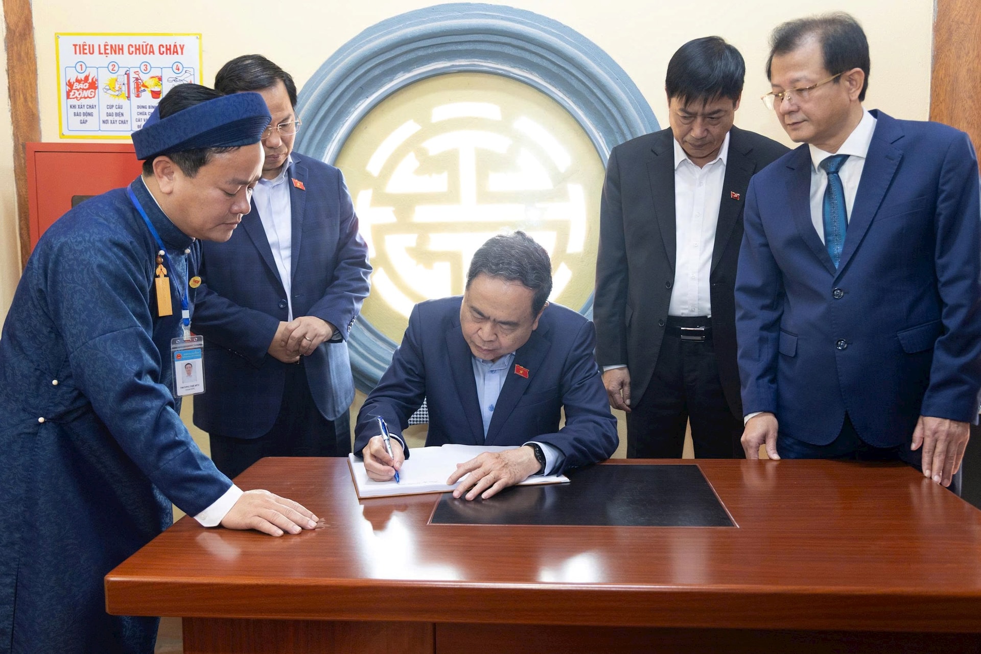 Chủ tịch Quốc hội Trần Thanh Mẫn viết lưu bút tại tại Khu lưu niệm Trưởng ban Thường trực Quốc hội Bùi Bằng Đoàn ở xã Ứng Thiên. Ảnh: Cao Hồng