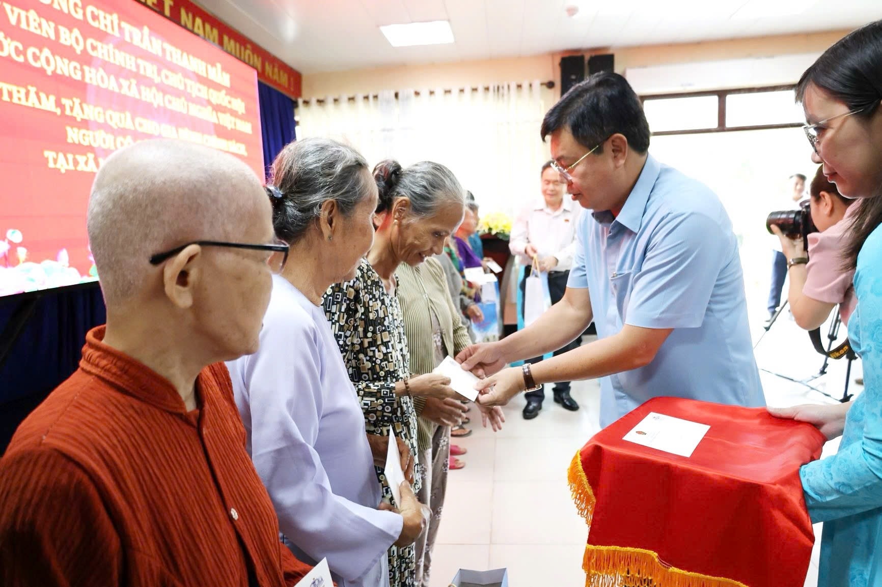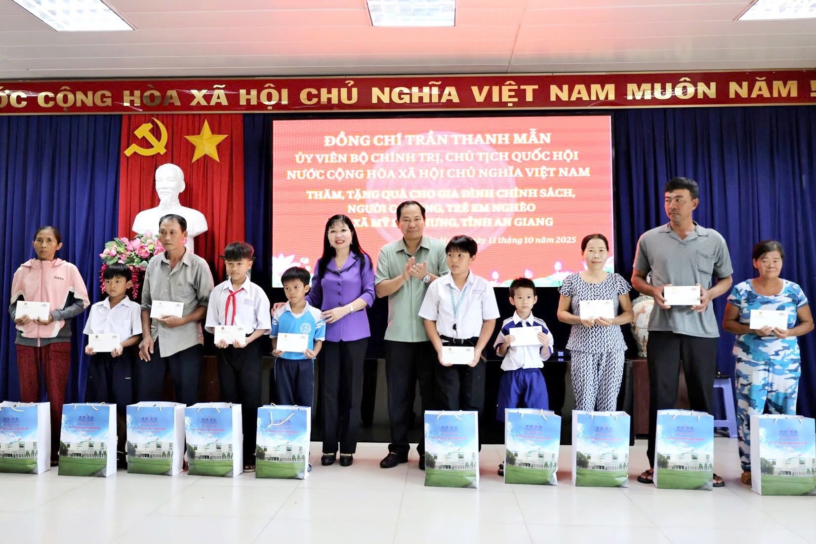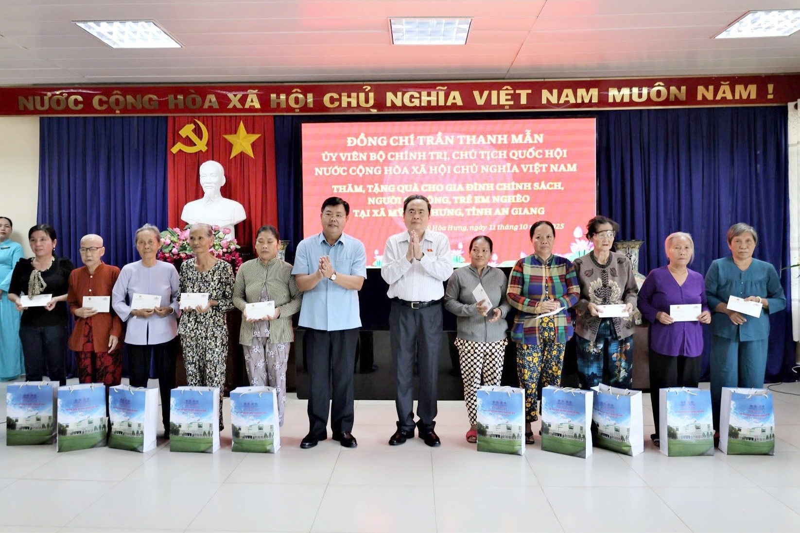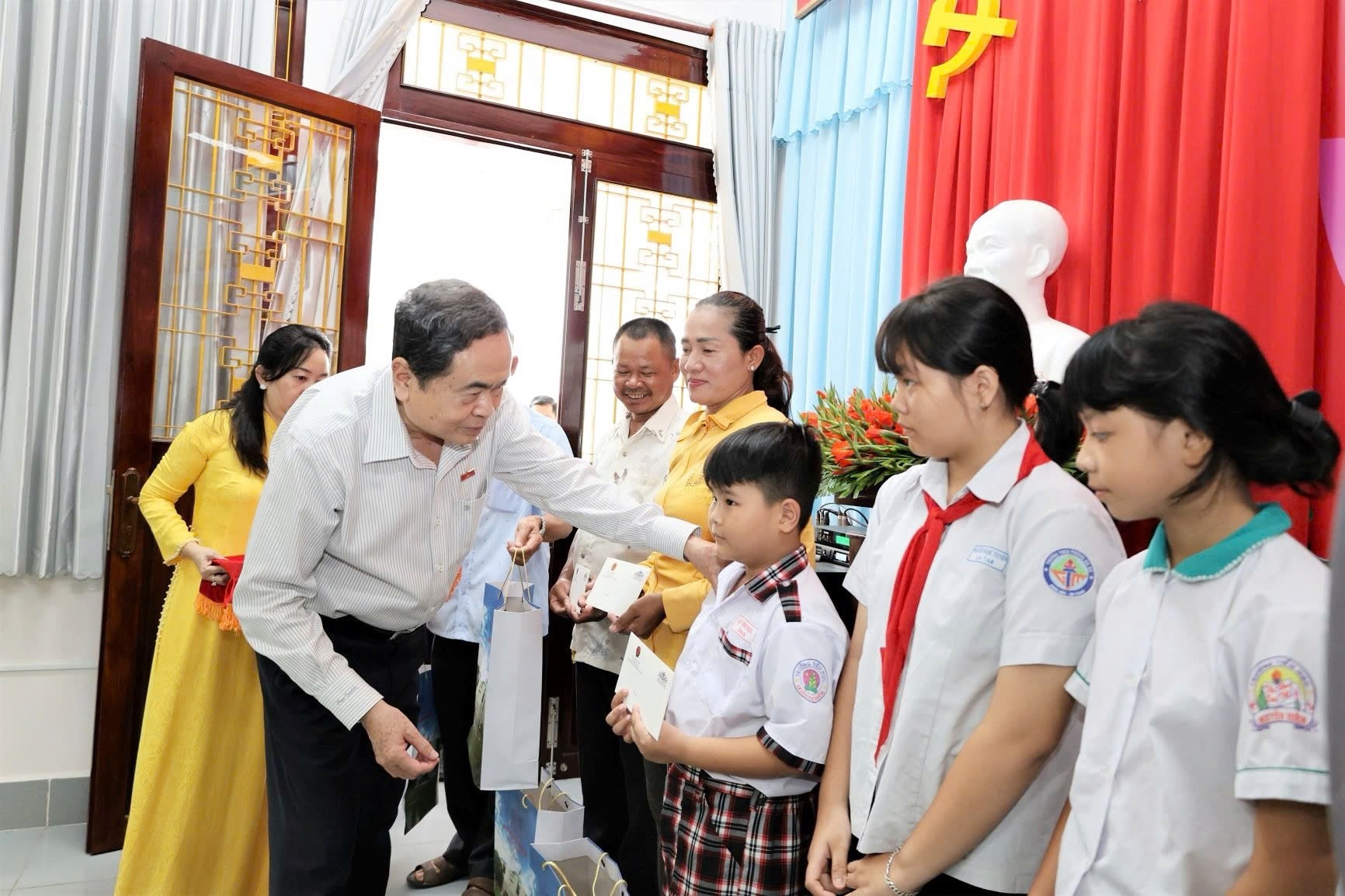 Chủ tịch Quốc hội Trần Thanh Mẫn trao quà tặng hộ gia đình chính sách, người có công, trẻ em đồng bào dân tộc nghèo của xã Mỹ Hòa Hưng. Ảnh: Hải Hành