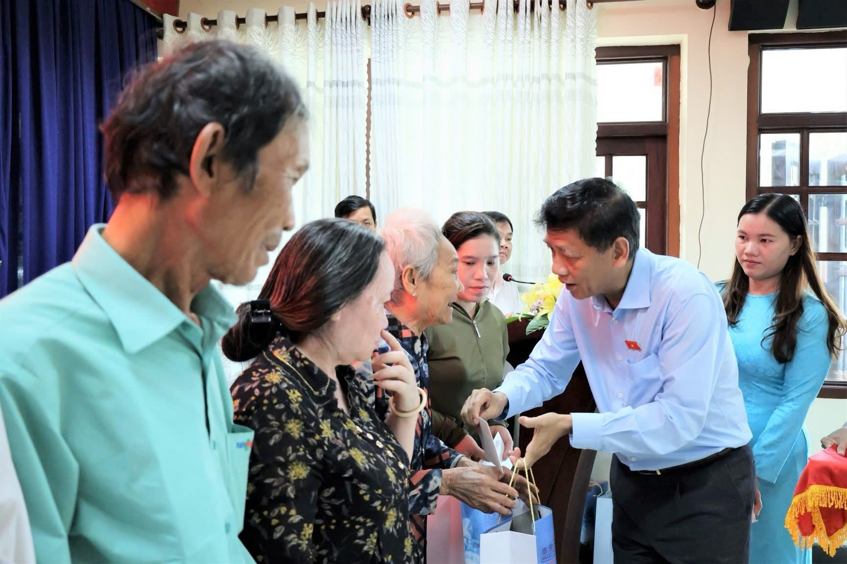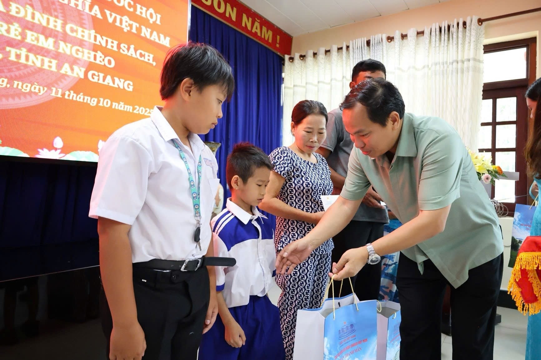 Phó Chủ nhiệm Ủy ban Công tác đại biểu Nguyễn Đại Thắng và Trưởng đoàn Đại biểu Quốc hội tỉnh, Chủ tịch Ủy ban MTTQ Việt Nam tỉnh An Giang Trần Thị Thanh Hương trao quà tặng gia đình chính sách, người có công, trẻ em, đồng bào dân tộc nghèo tại phường Vĩnh Tế và phường Châu Đốc, tỉnh An Giang. Ảnh: Hải Hành