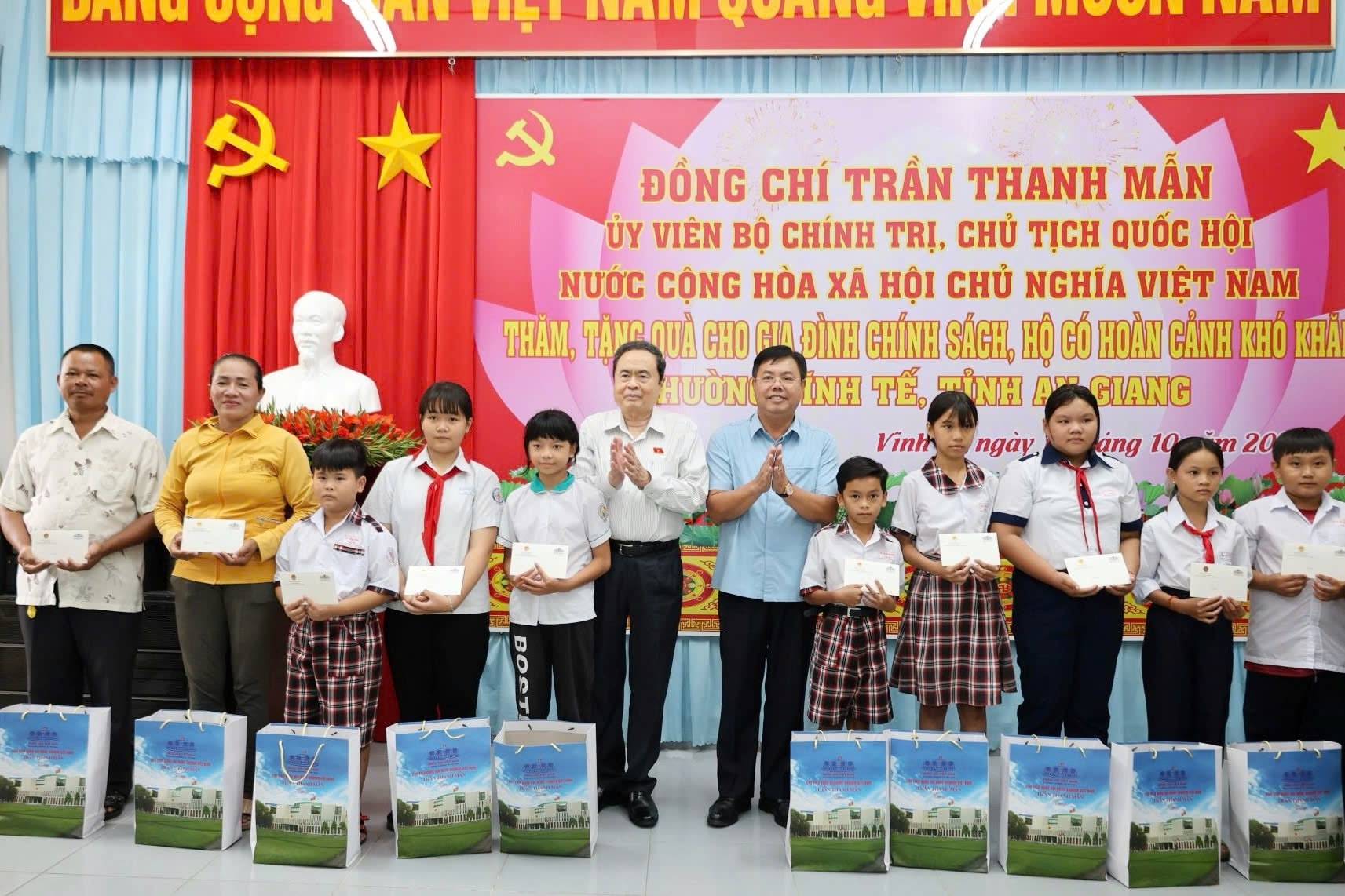 Chủ tịch Quốc hội Trần Thanh Mẫn và Bí thư Tỉnh ủy An Giang Nguyễn Tiến Hải trao quà tặng gia đình chính sách, người có công, trẻ em, đồng bào dân tộc nghèo tại phường Vĩnh Tế và phường Châu Đốc, tỉnh An Giang. Ảnh: Hải Hành