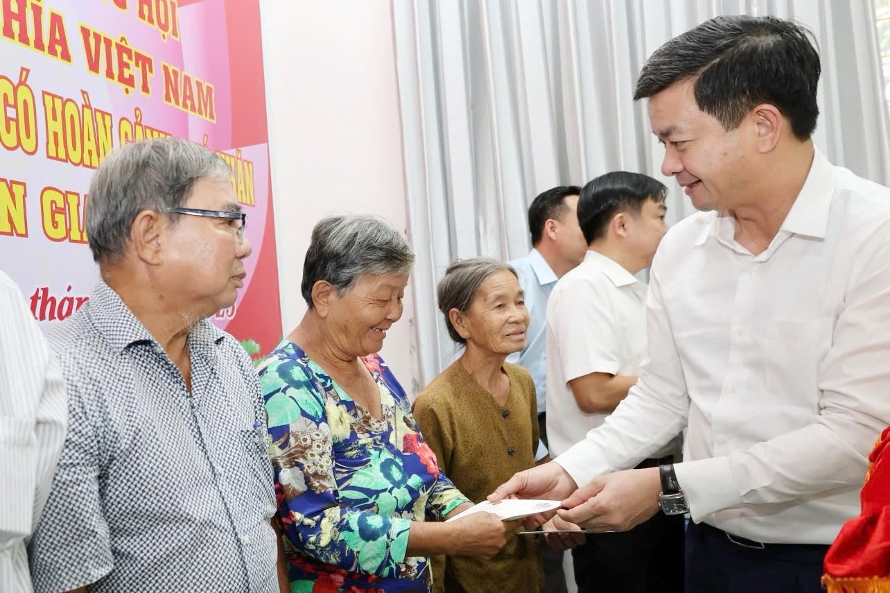 Bí thư Thành ủy Cần Thơ Lê Quang Tùng trao quà tặng gia đình chính sách, người có công, trẻ em, đồng bào dân tộc nghèo tại phường Vĩnh Tế và phường Châu Đốc, tỉnh An Giang. Ảnh: Hải Hành