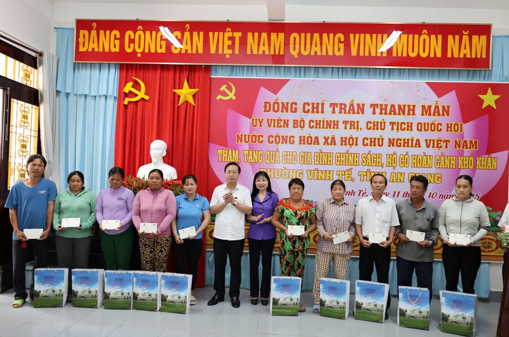 + Cũng trong sáng nay, Chủ tịch Quốc hội Trần Thanh Mẫn và Đoàn công tác đã trao 100 suất quà tặng gia đình chính sách, người có công, trẻ em, đồng bào dân tộc nghèo tại phường Vĩnh Tế và phường Châu Đốc, tỉnh An Giang.