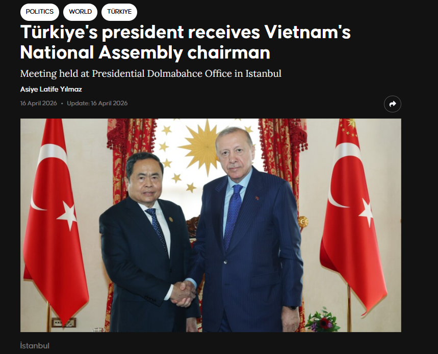 Bài viết và hình ảnh cuộc hội kiến của Chủ tịch Quốc hội Trần Thanh Mẫn và Tổng thống Recep Tayyip Erdoğan đăng tải trên hãng thông tấn Anadolu