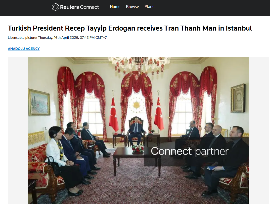 Hình ảnh cuộc hội kiến của Chủ tịch Quốc hội Trần Thanh Mẫn với Tổng thống Recep Tayyip Erdogan cũng được phát hành rộng rãi qua hệ thống Reuters Connect.