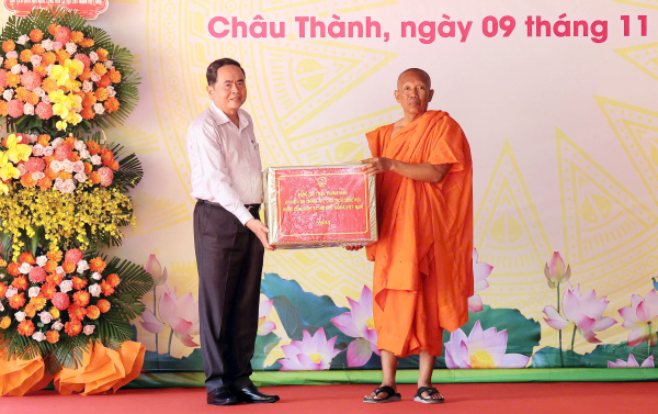 Chủ tịch Quốc hội Trần Thanh Mẫn tặng quà Chùa Tum Núp.