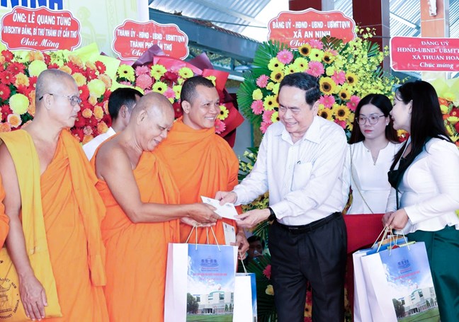 Chủ tịch Quốc hội Trần Thanh Mẫn tặng quà đại diện Chùa Tum Núp