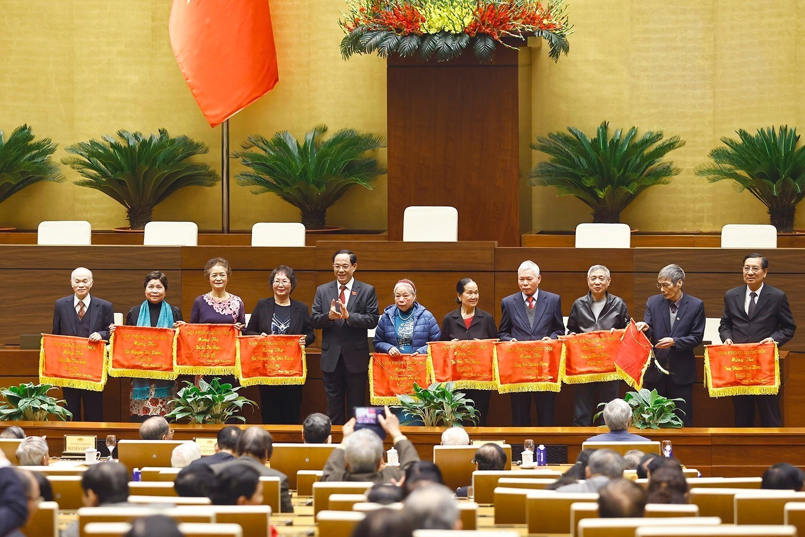 Chủ tịch Quốc hội Trần Thanh Mẫn tặng bức trướng mừng thọ nguyên lãnh đạo Quốc hội qua các thời kỳ. (Ảnh: TTXVN)