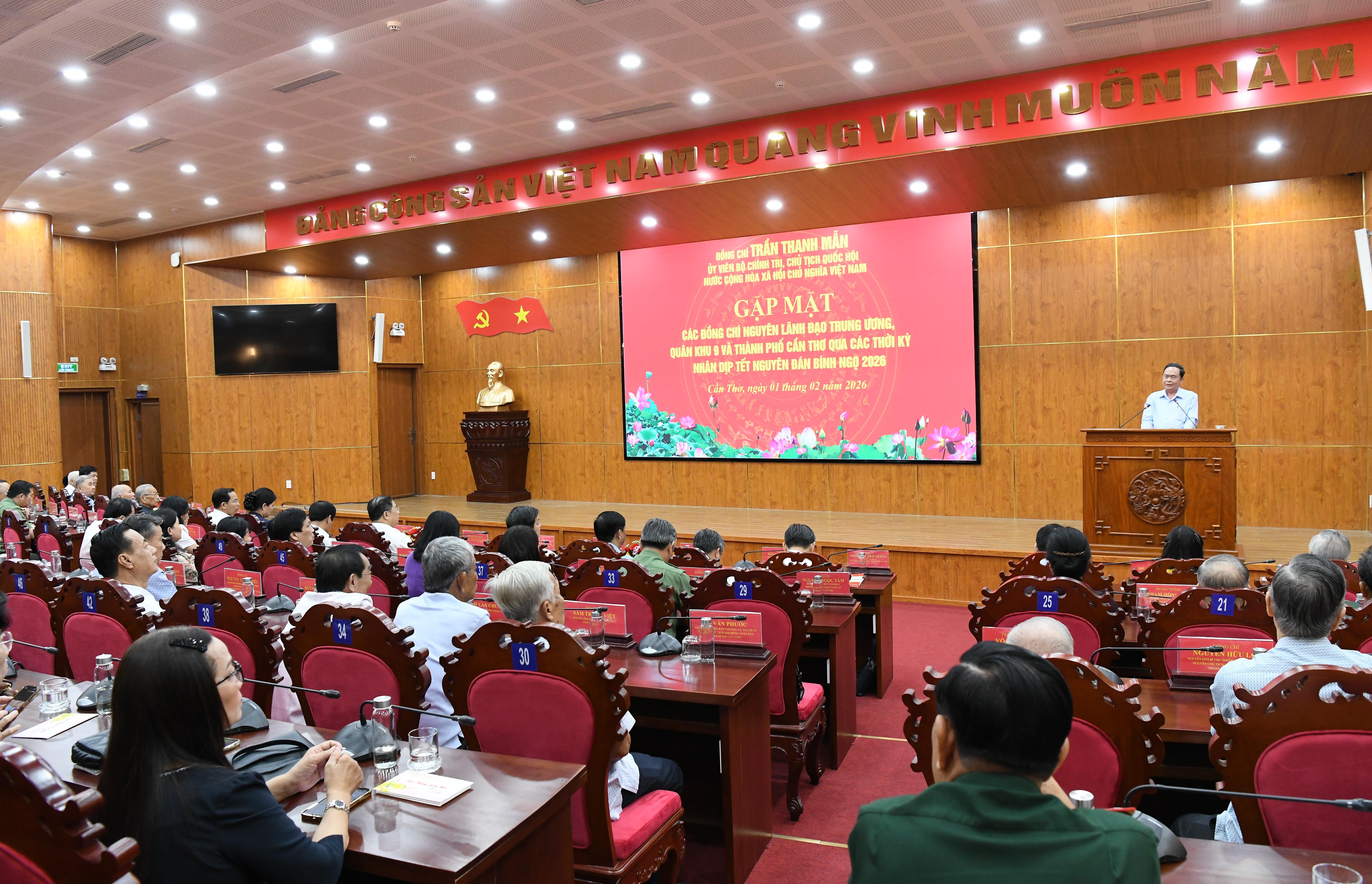 Chủ tịch Quốc hội trân trọng chuyển lời thăm hỏi ân cần và lời chúc mừng năm mới tốt đẹp nhất của Tổng Bí thư Tô Lâm và Thủ tướng Chính phủ Phạm Minh Chính tới các đồng chí nguyên lãnh đạo Trung ương, Quân khu 9, thành phố Cần Thơ cùng toàn thể Nhân dân thành phố Cần Thơ.