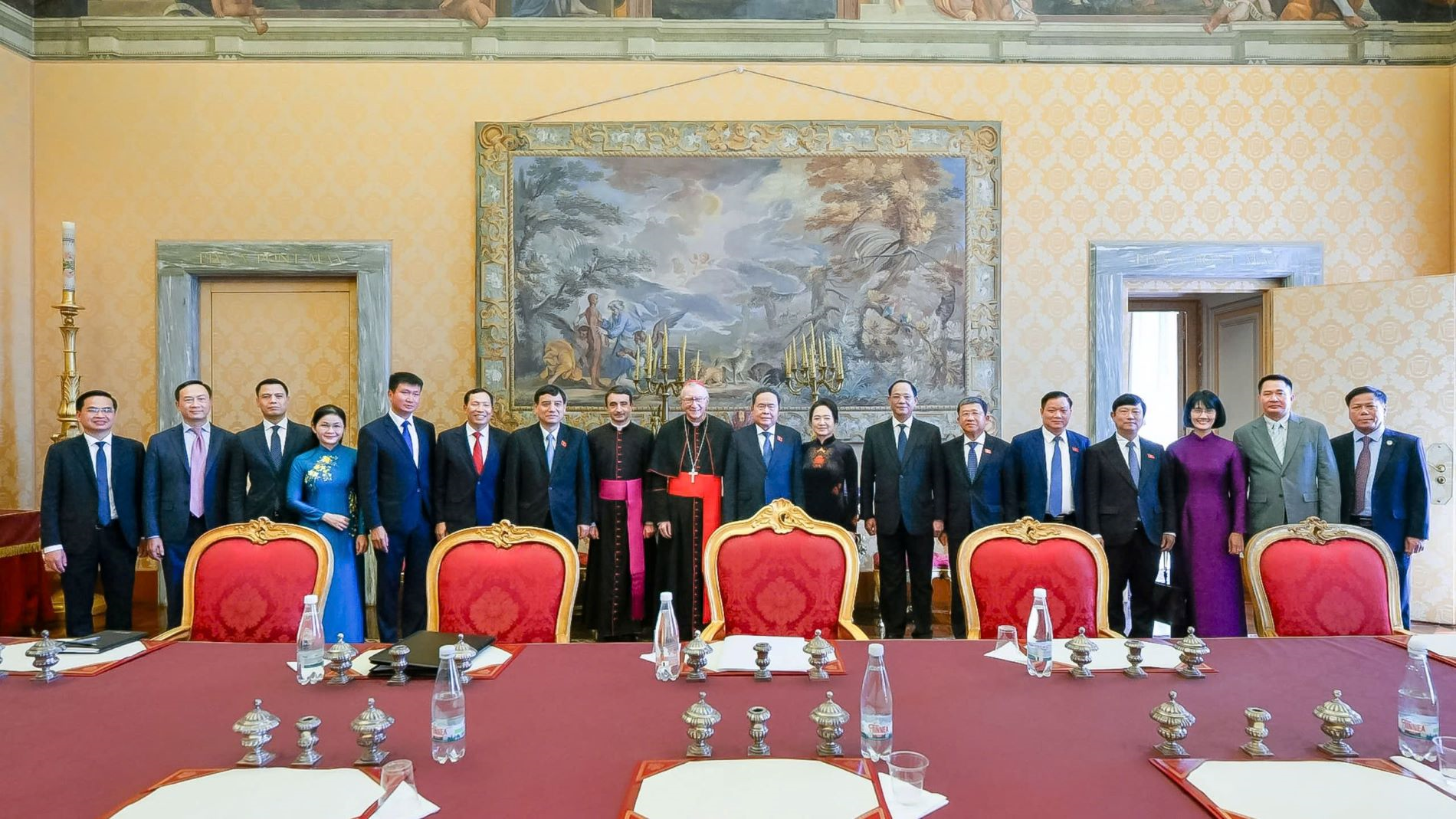 Chủ tịch Quốc hội Trần Thanh Mẫn hội kiến Thủ tướng Tòa thánh Vatican Pietro Parolin. Ảnh: Vatican Media
