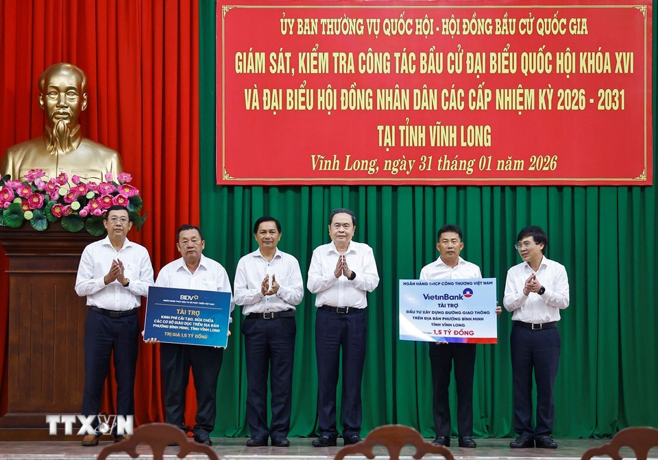 Chủ tịch Quốc hội Trần Thanh Mẫn chứng kiến Ngân hàng TMCP Đầu tư và Phát triển Việt Nam, Ngân hàng TMCP Công thương Việt Nam tài trợ tiền đầu tư xây dựng đường giao thông và các cơ sở giáo dục trên địa bàn tỉnh. (Ảnh: Doãn Tấn/TTXVN)