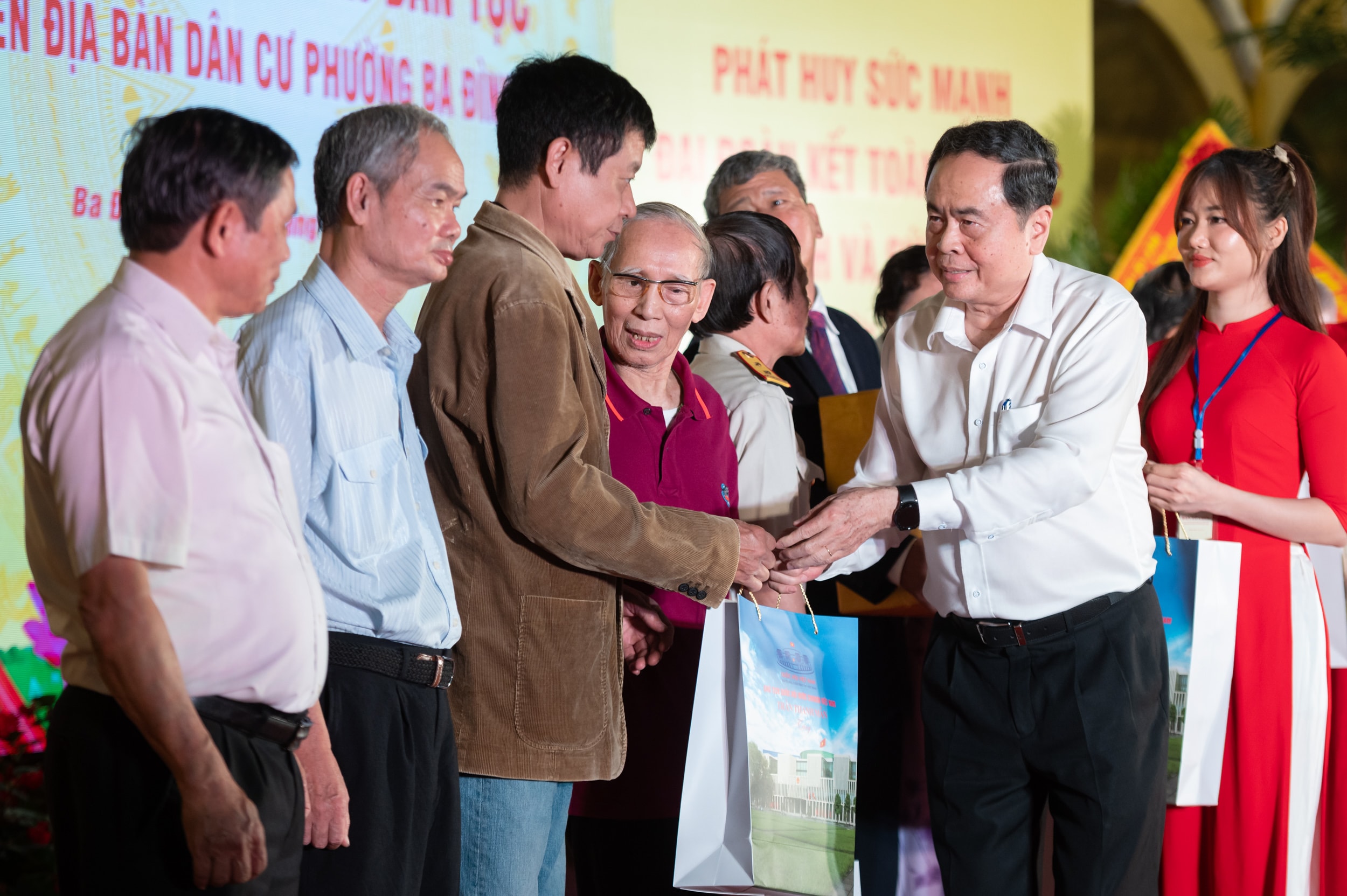 Chủ tịch Quốc hội Trần Thanh Mẫn trao quà lưu niệm tặng Ban tổ chức ngày hội và gia đình chính sách tiêu biểu trên địa bàn phường Ba Đình