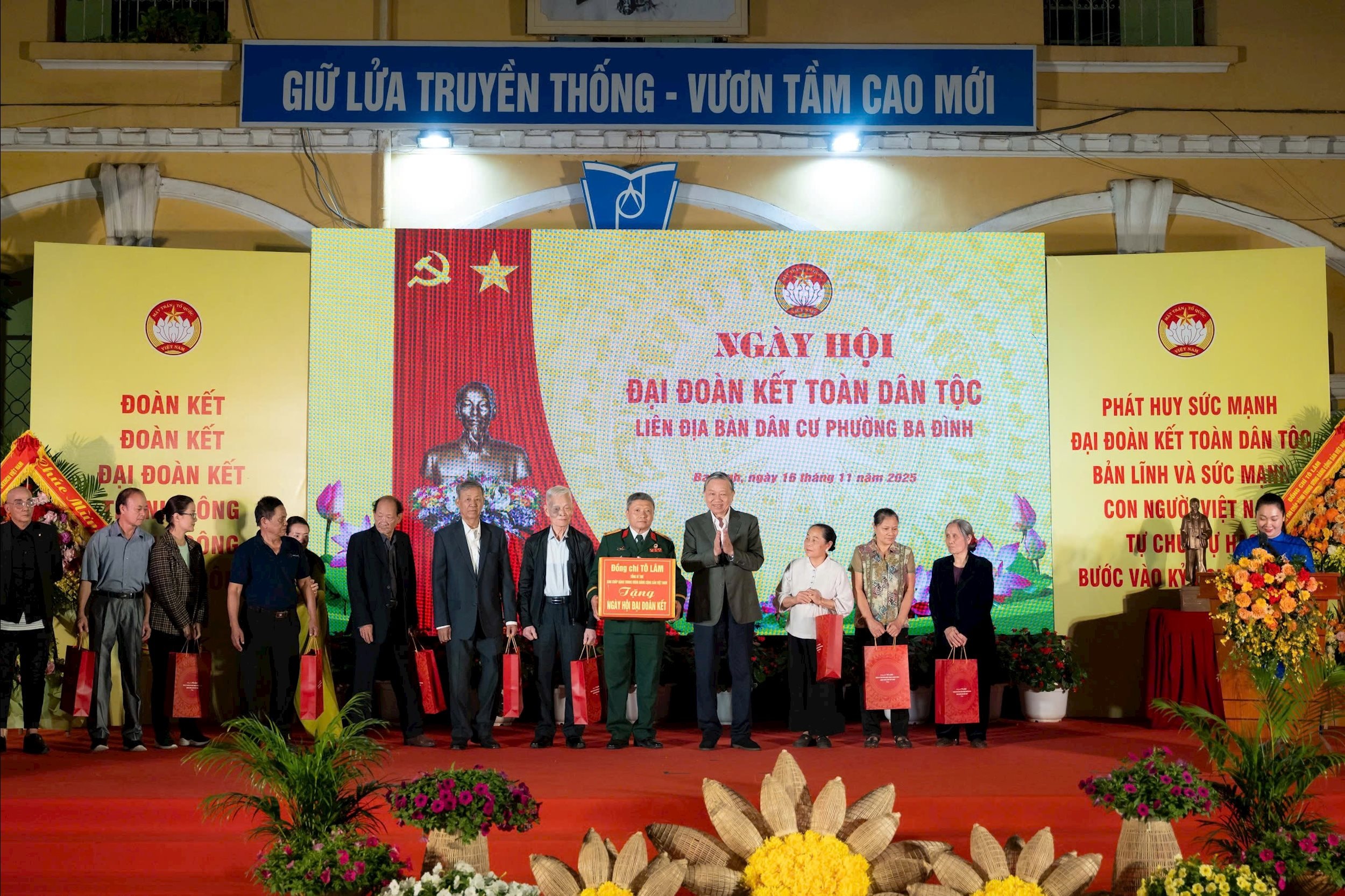 Tổng Bí thư Tô Lâm trao quà tặng tập thể đơn vị tổ chức Ngày hội và 10 hộ gia đình chính sách trên địa bàn phường Ba Đình