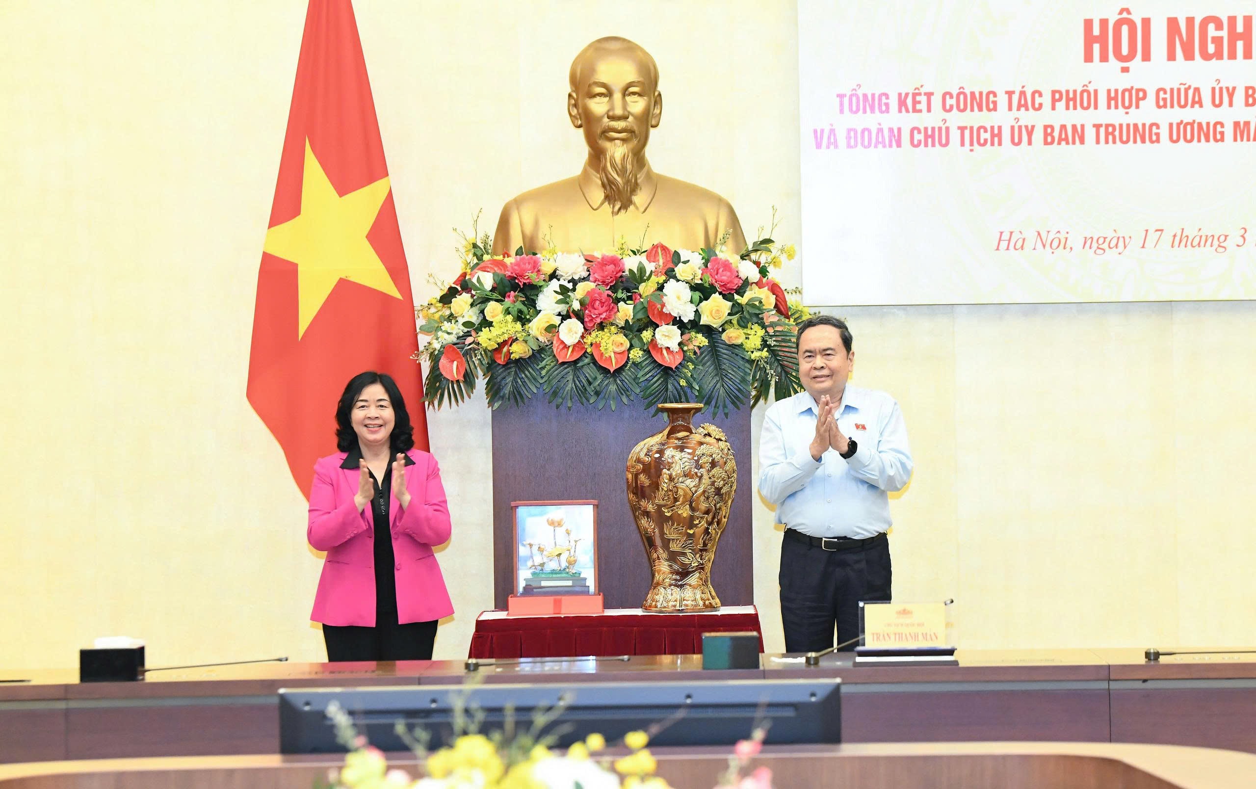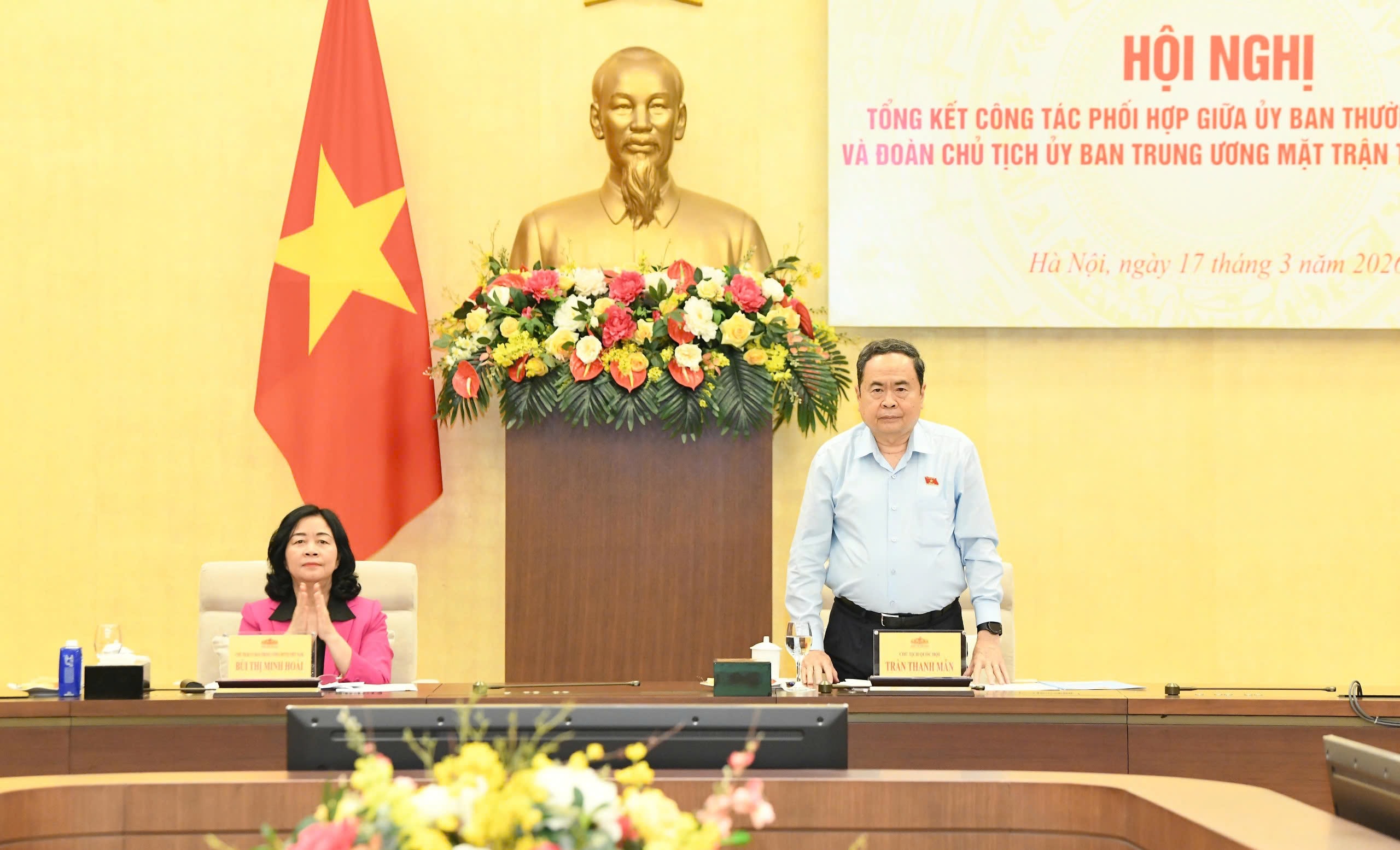 Như Báo Đại biểu Nhân dân đã đưa tin, chiều nay, 17/3, tại Nhà Quốc hội, Ủy viên Bộ Chính trị, Chủ tịch Quốc hội Trần Thanh Mẫn và Ủy viên Bộ Chính trị, Bí thư Trung ương Đảng, Chủ tịch Ủy ban Trung ương MTTQ Việt Nam Bùi Thị Minh Hoài đồng chủ trì Hội nghị tổng kết công tác phối hợp giữa Ủy ban Thường vụ Quốc hội và Đoàn Chủ tịch Ủy ban Trung ương MTTQ Việt Nam (hai cơ quan).