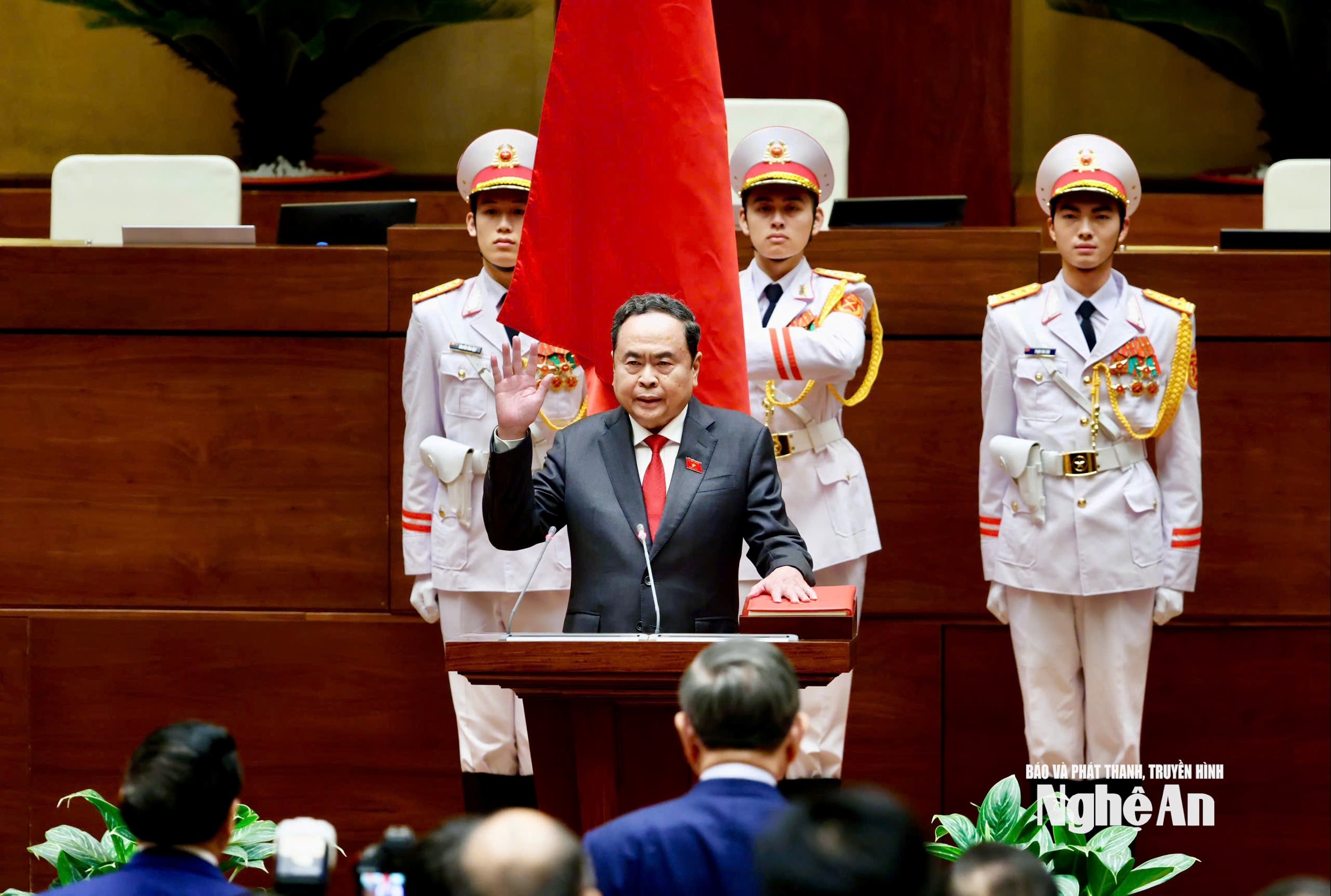 "Dưới cờ đỏ sao vàng thiêng liêng của Tổ quốc, trước Quốc hội và đồng bào, cử tri cả nước, tôi, Chủ tịch Quốc hội nước Cộng hòa xã hội chủ nghĩa Việt Nam xin tuyên thệ: Tuyệt đối trung thành với Tổ quốc, với Nhân dân, với Hiến pháp nước Cộng hòa xã hội chủ nghĩa Việt Nam, nỗ lực phấn đấu, hoàn thành tốt nhiệm vụ được Đảng, Nhà nước và Nhân dân giao phó", Chủ tịch Quốc hội Trần Thanh Mẫn tuyên thệ.